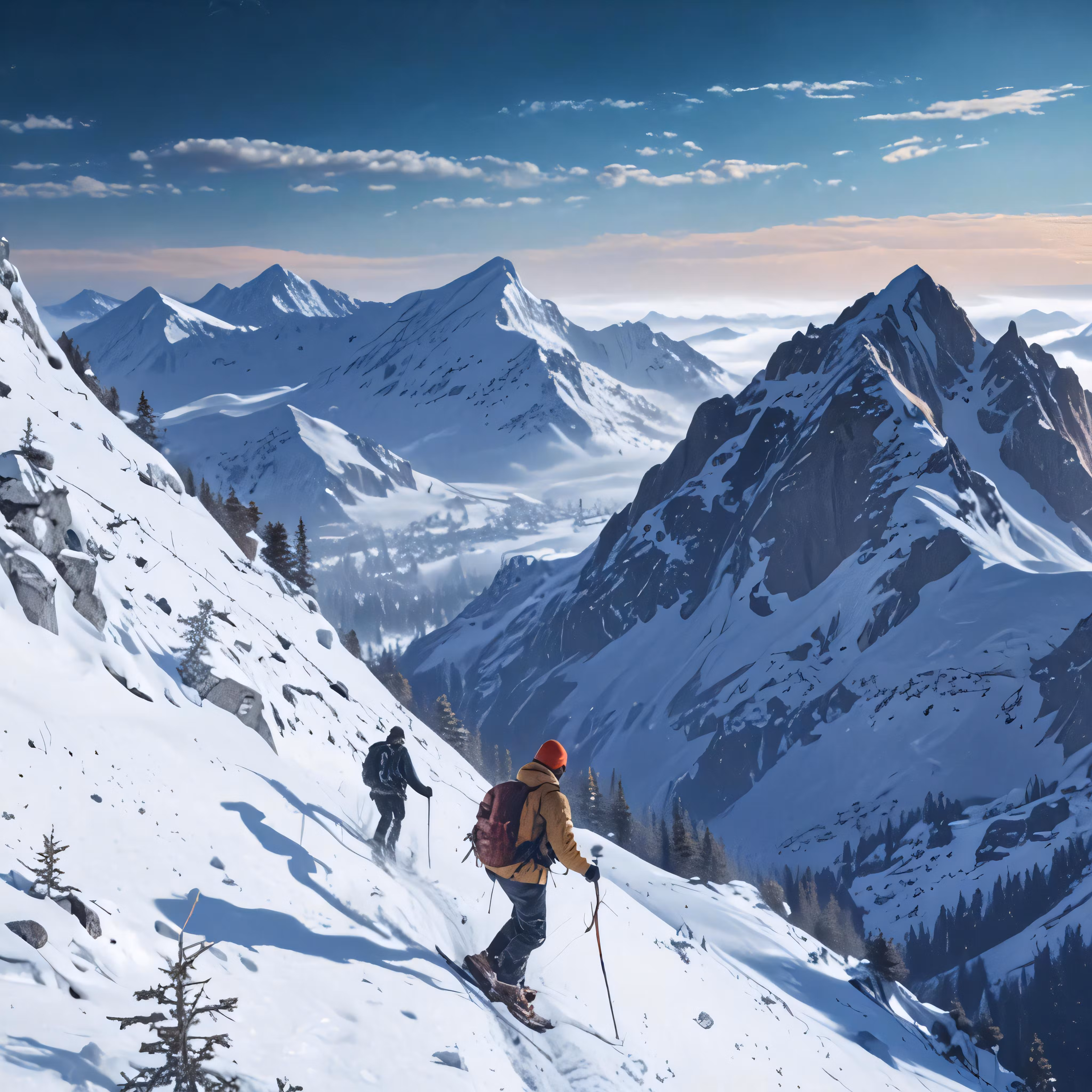 High resolution picture, free to use, skiers skiing down a large snowy mountain at sunset