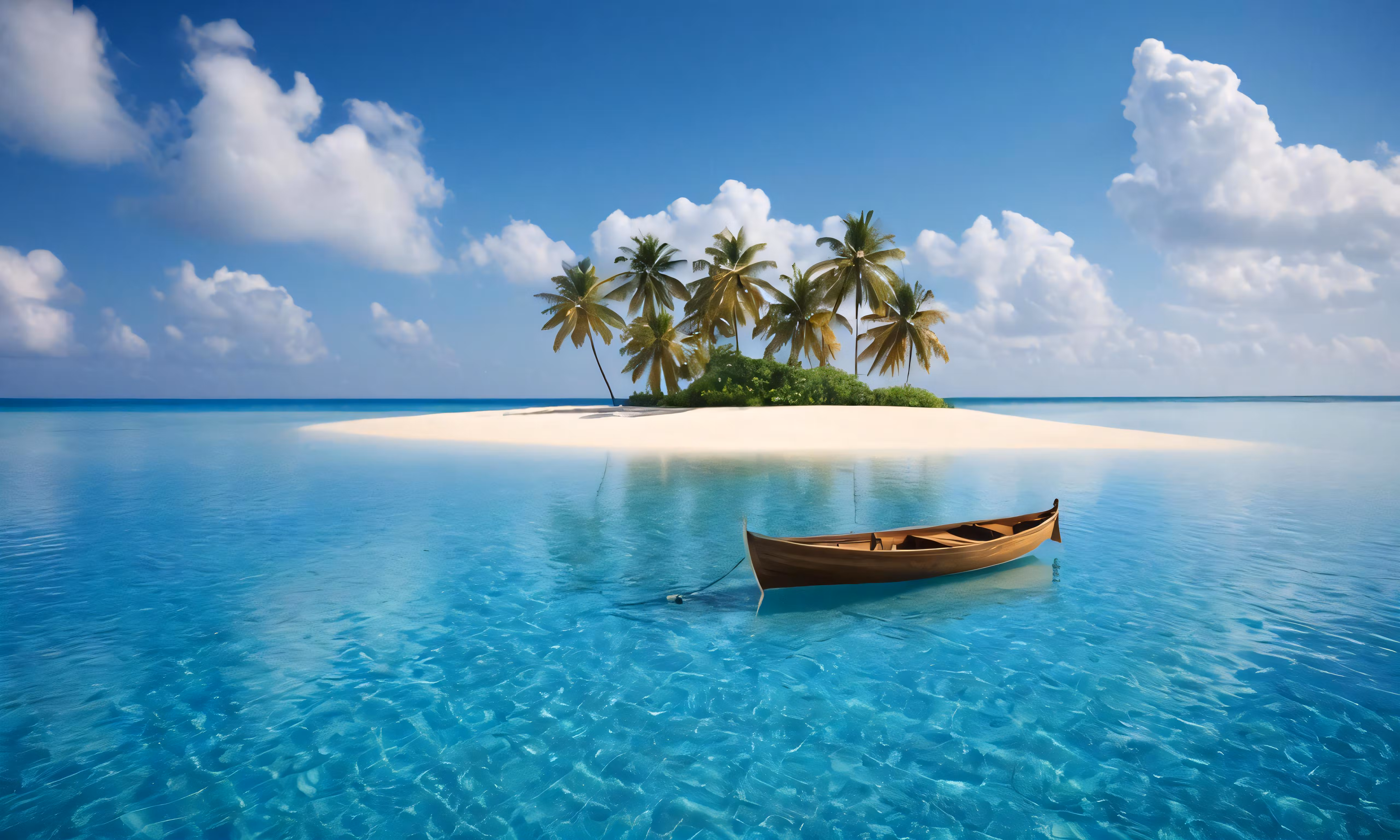 High resolution picture, free to use, small boat sitting in clear, blue waters by a deserted beach