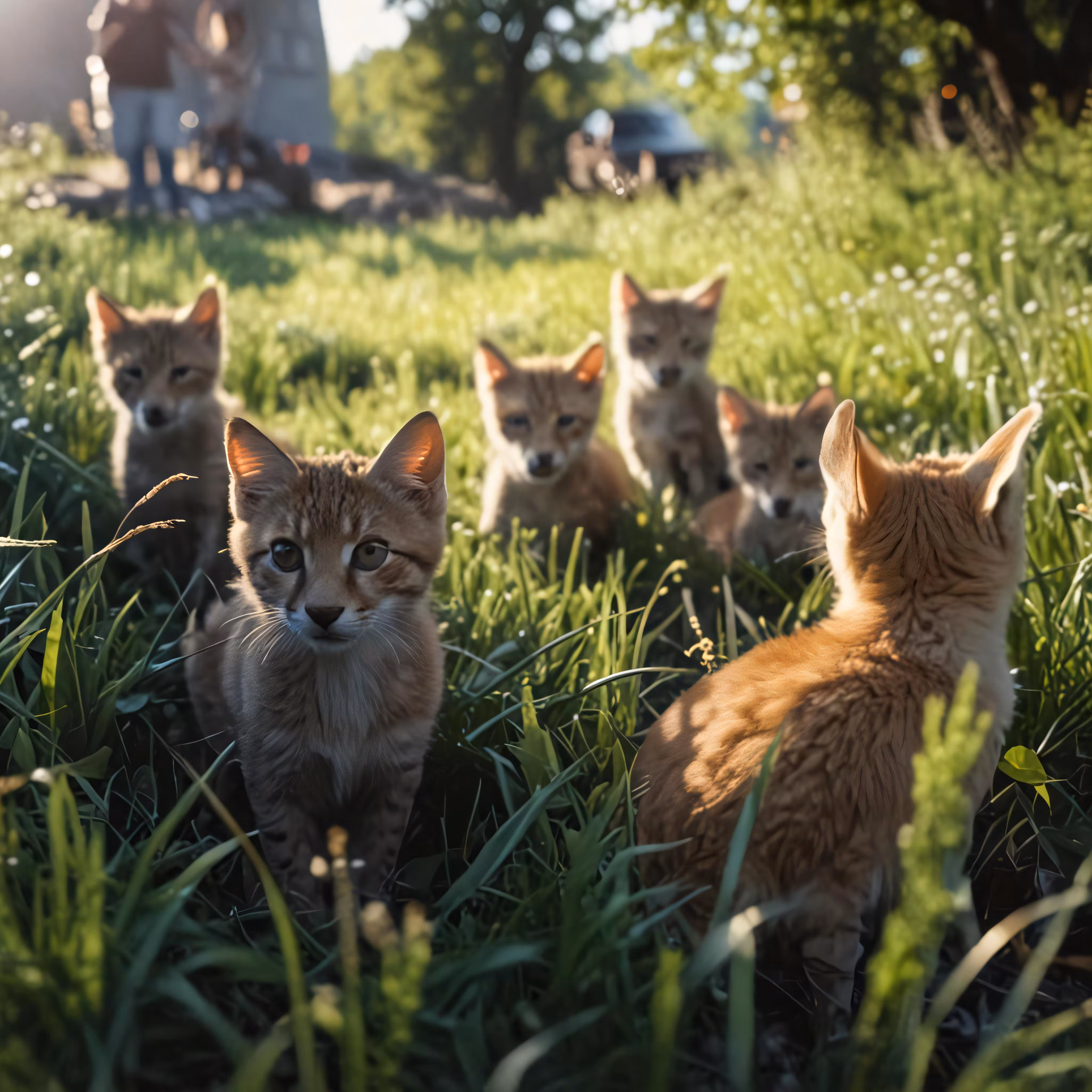 High resolution picture, free to use, small kittens sitting in a grass field and looking off to the right