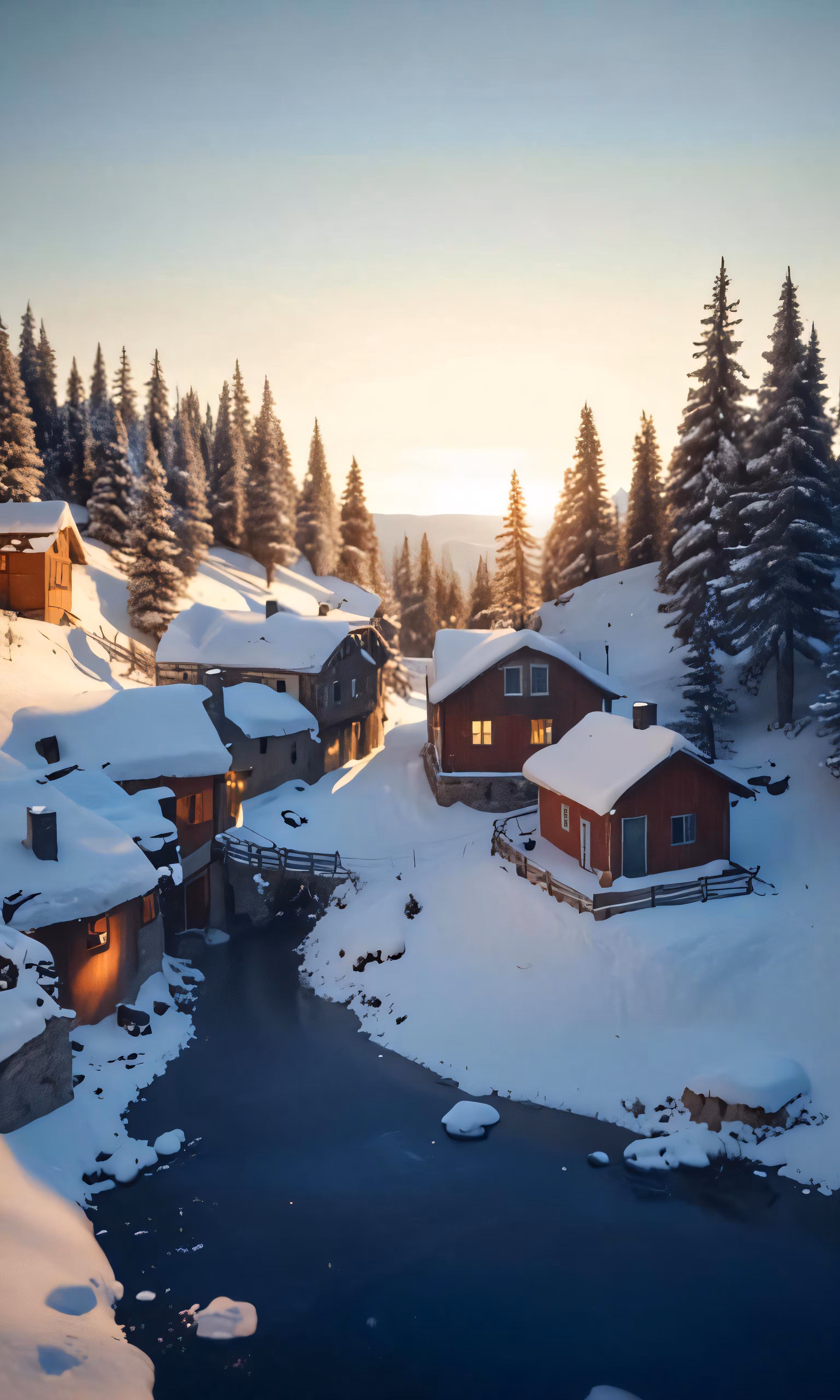 High resolution picture, free to use, small lake with ice covered snow and pine trees