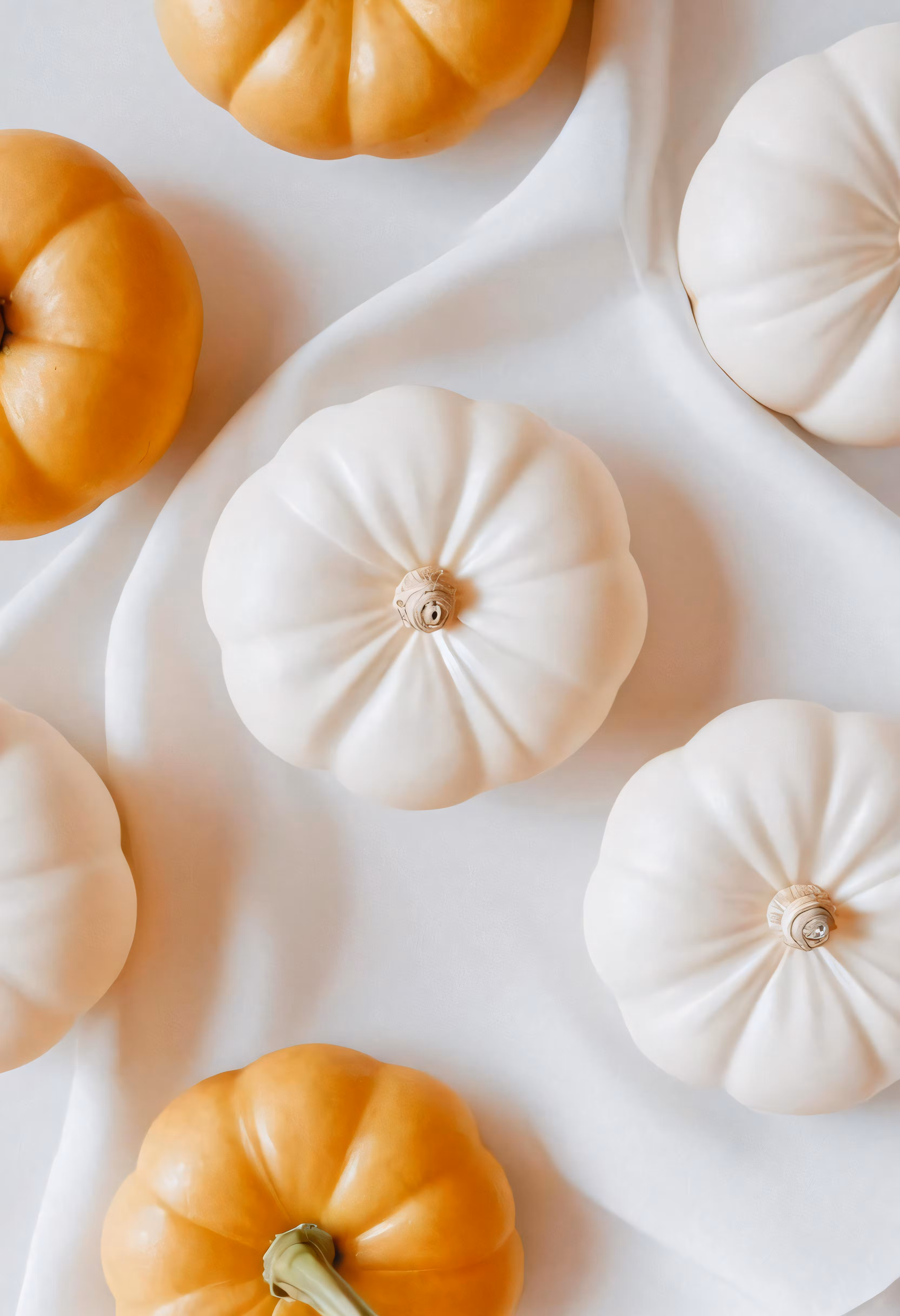 High resolution picture, free to use, small pumpkins sit on a white plate on a white surface