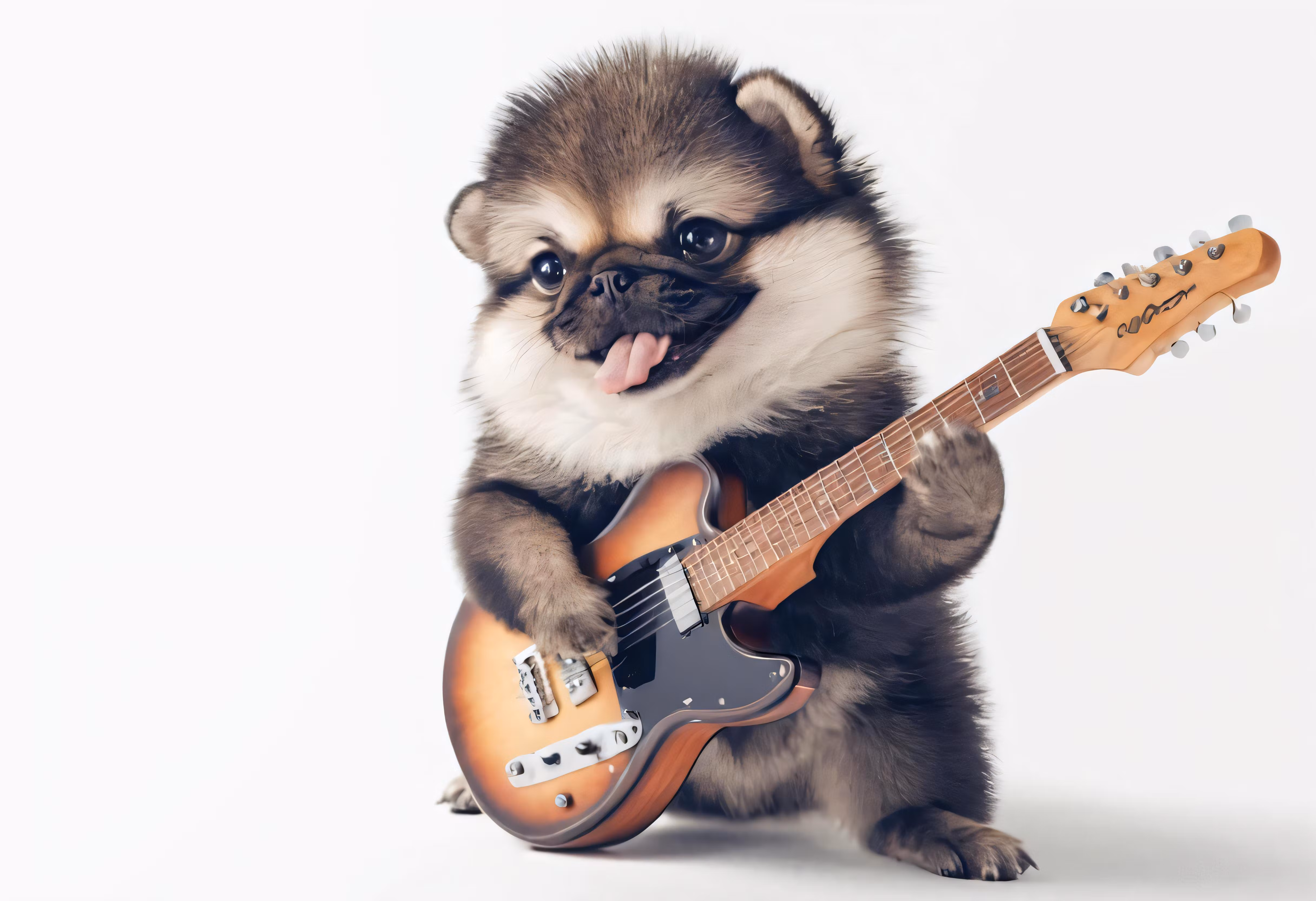 High resolution picture, free to use, small puppy sitting on a white floor with an electric guitar