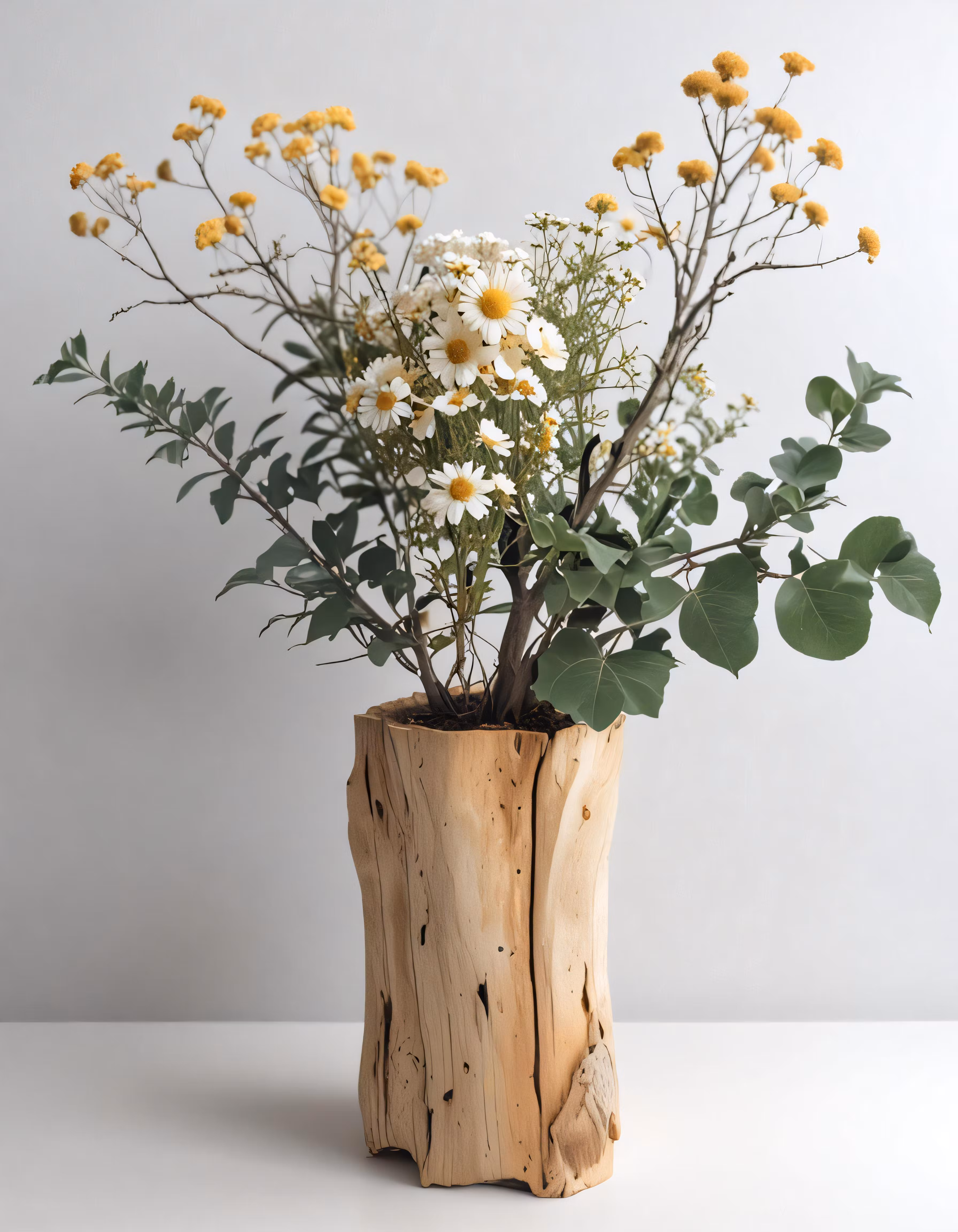 High resolution picture, free to use, small yellow and white flowers in a vase made out of a tree trunk