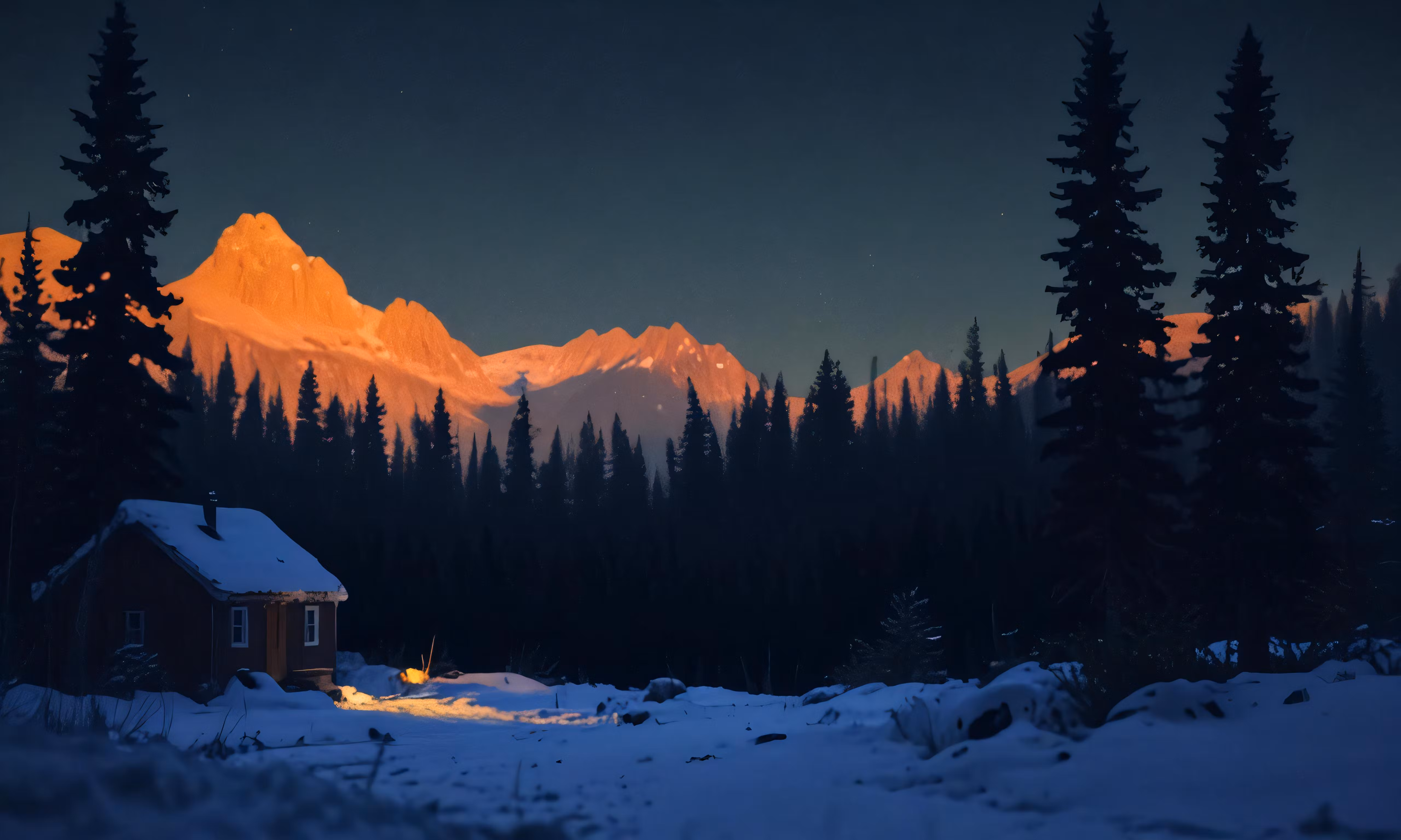 High resolution picture, free to use, snow covered forest with a small cabin in the foreground