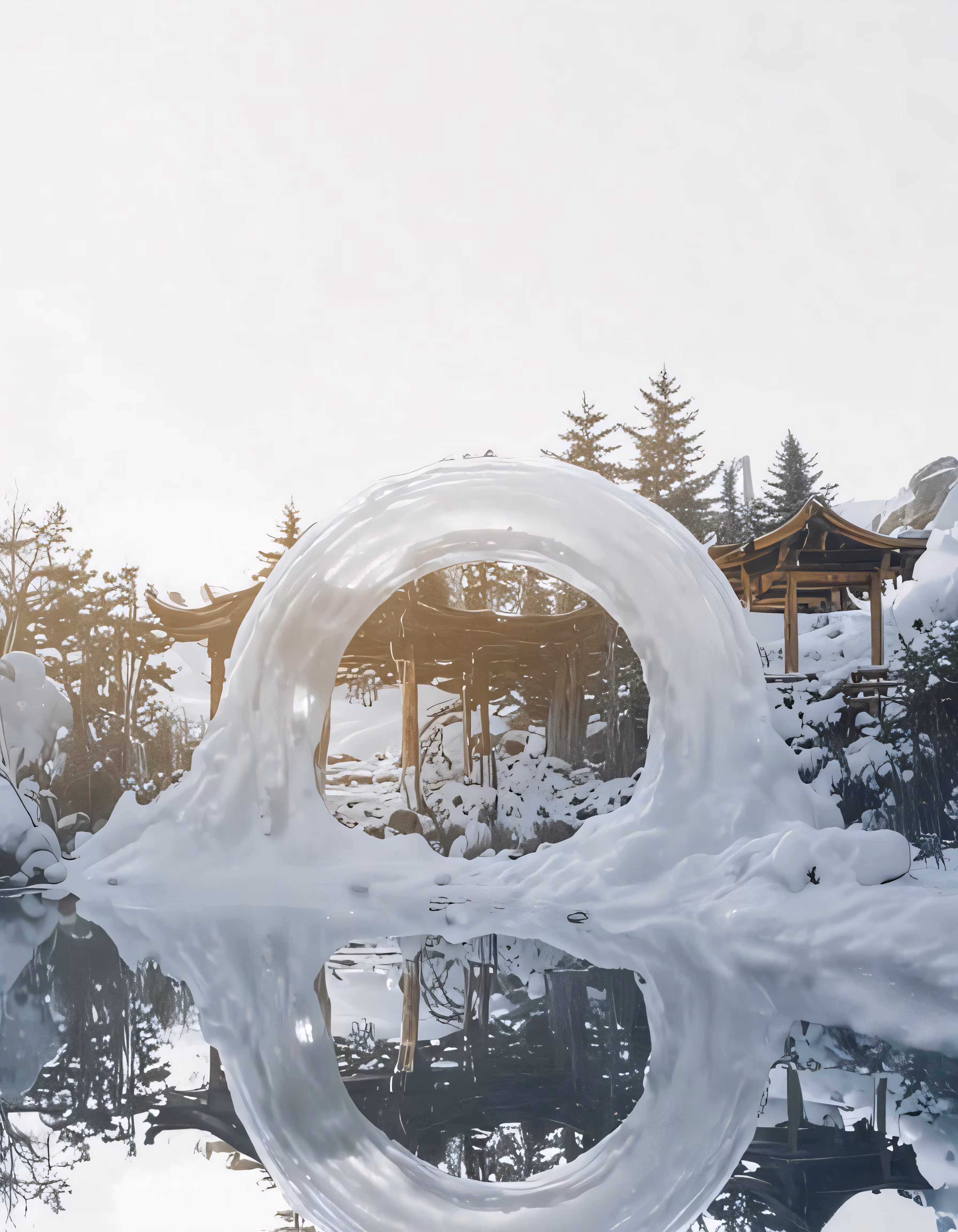 High resolution picture, free to use, snow sculpture with circles in center surrounded by water