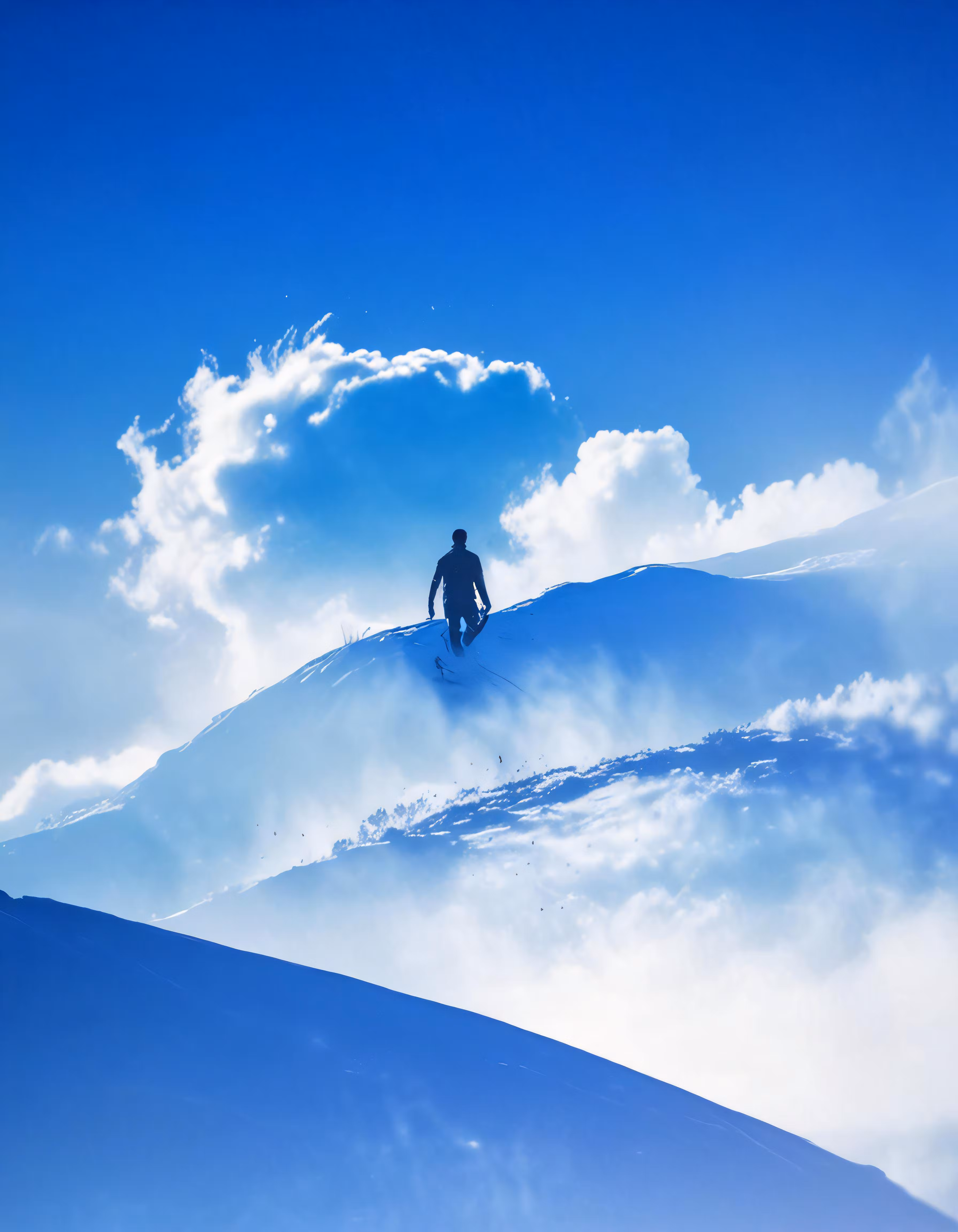 High resolution picture, free to use, snowboarder standing at the top of a snow covered mountain
