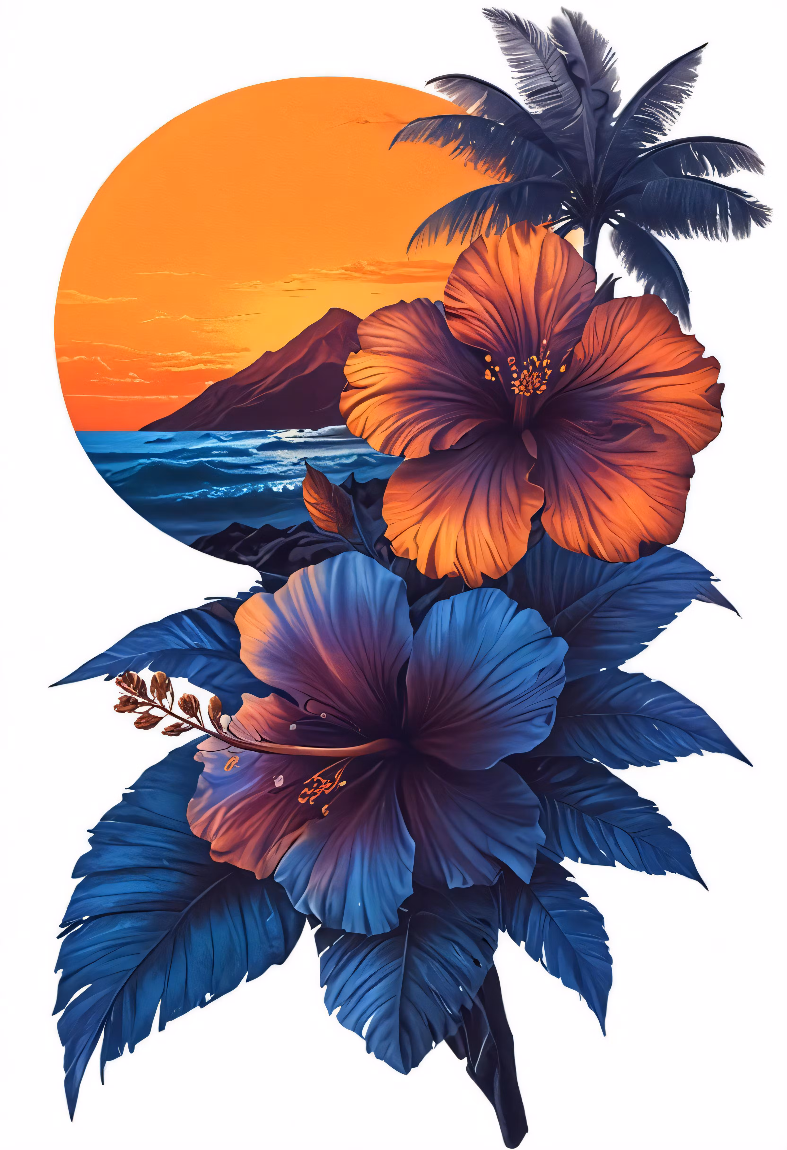 High resolution picture, free to use, some big pretty flowers and plants in front of an orange and blue sunset