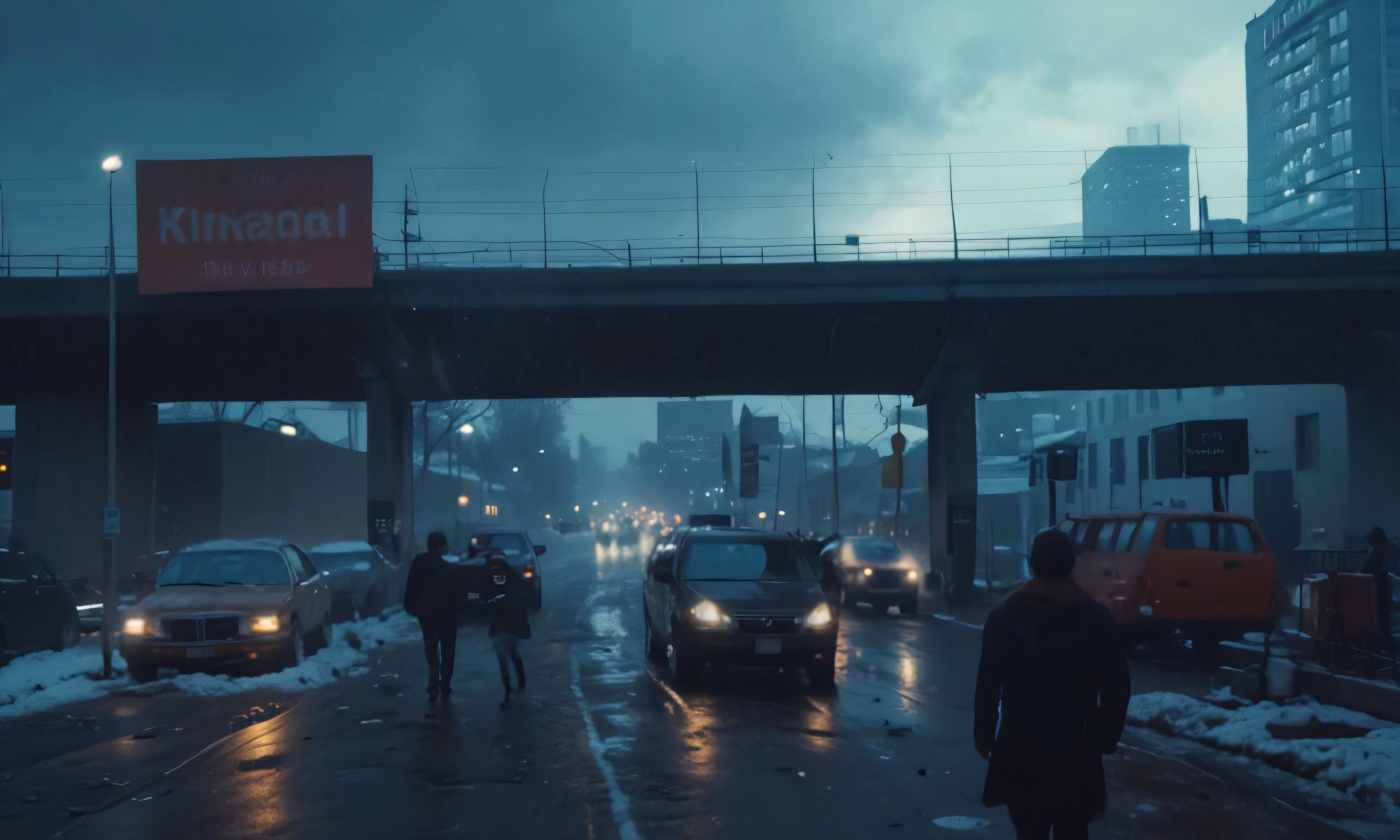 High resolution picture, free to use, some cars a bridge and some snow and people