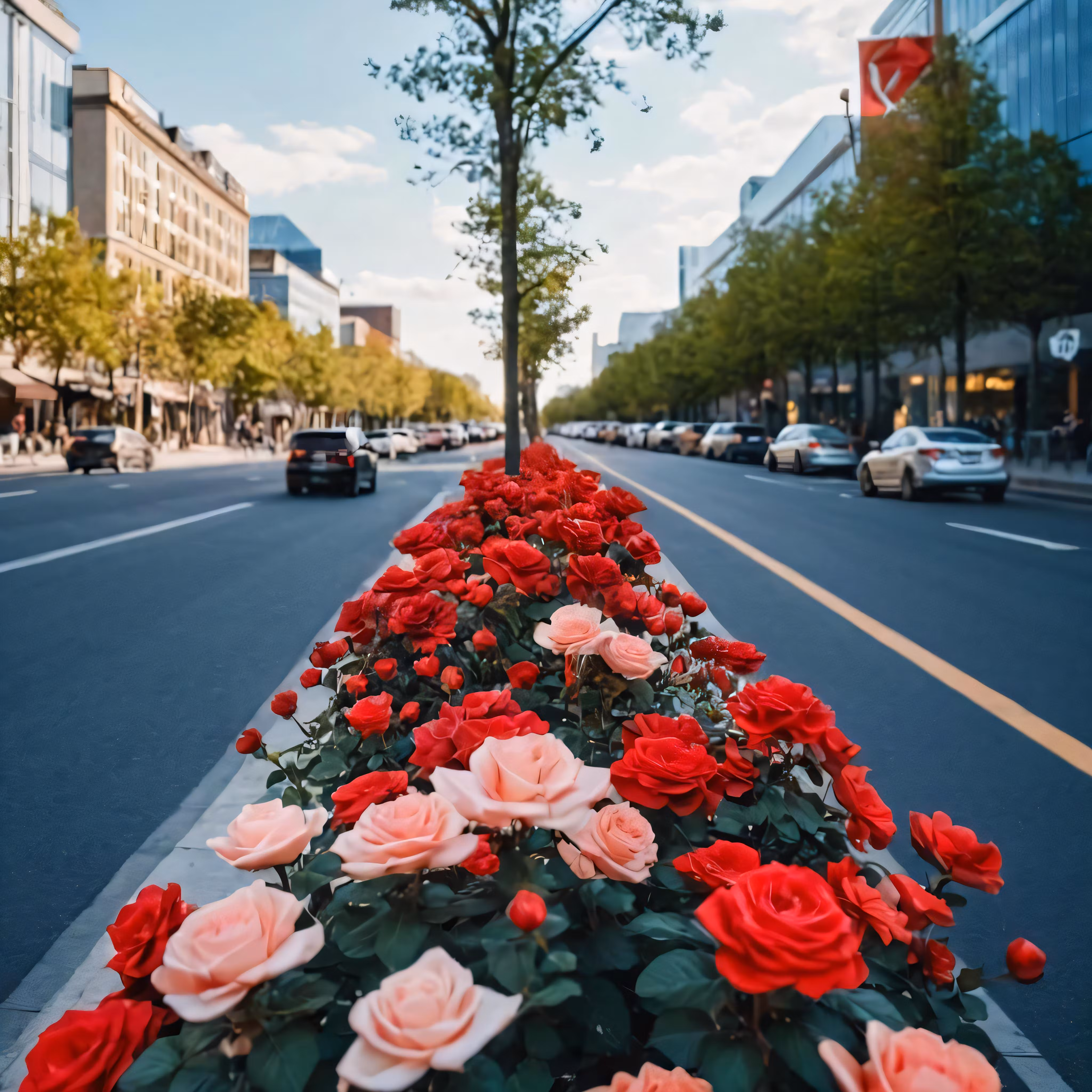 High resolution picture, free to use, some cars on a street and a bunch of flowers