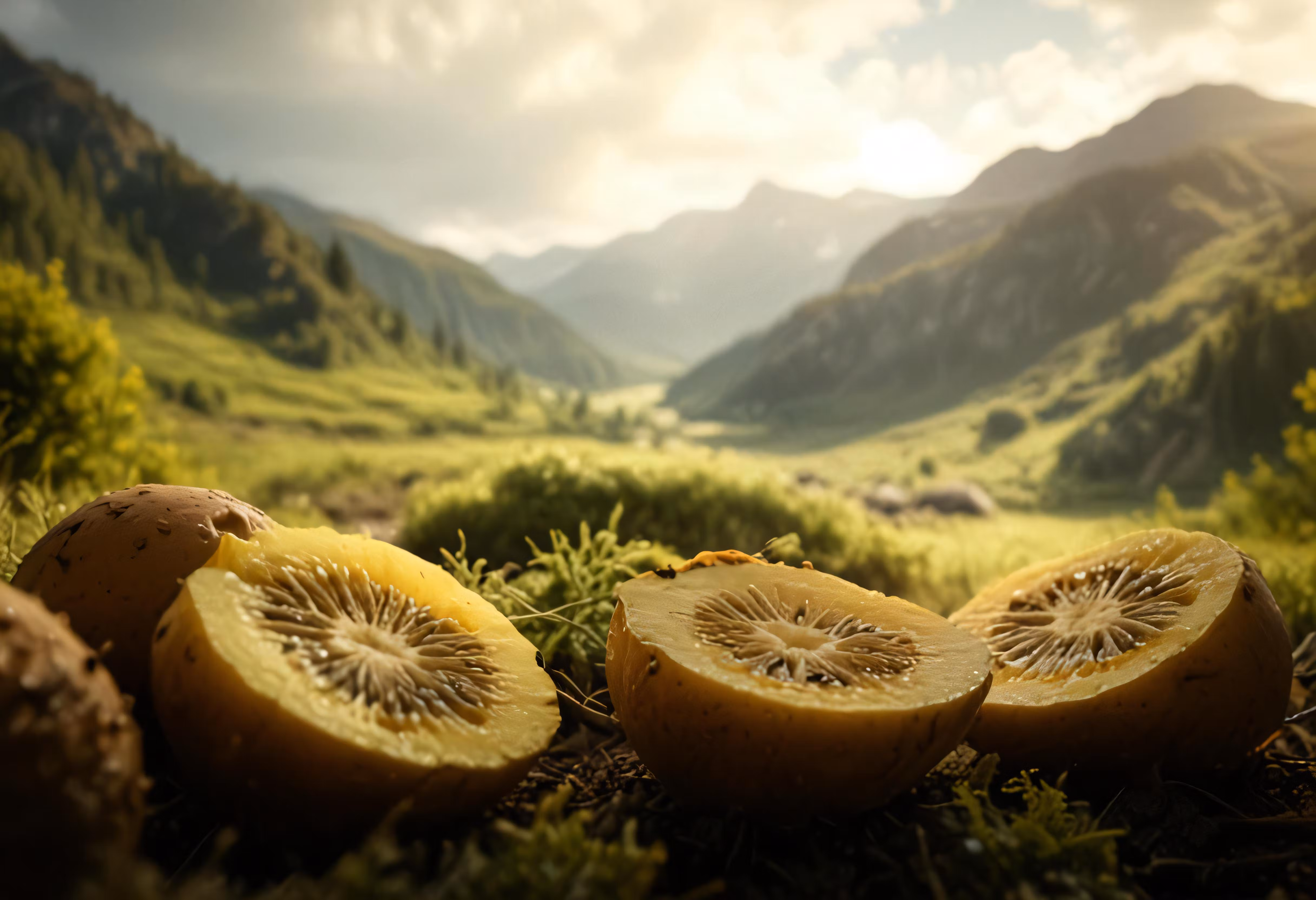 High resolution picture, free to use, some fruit is sitting on the grass near some mountains