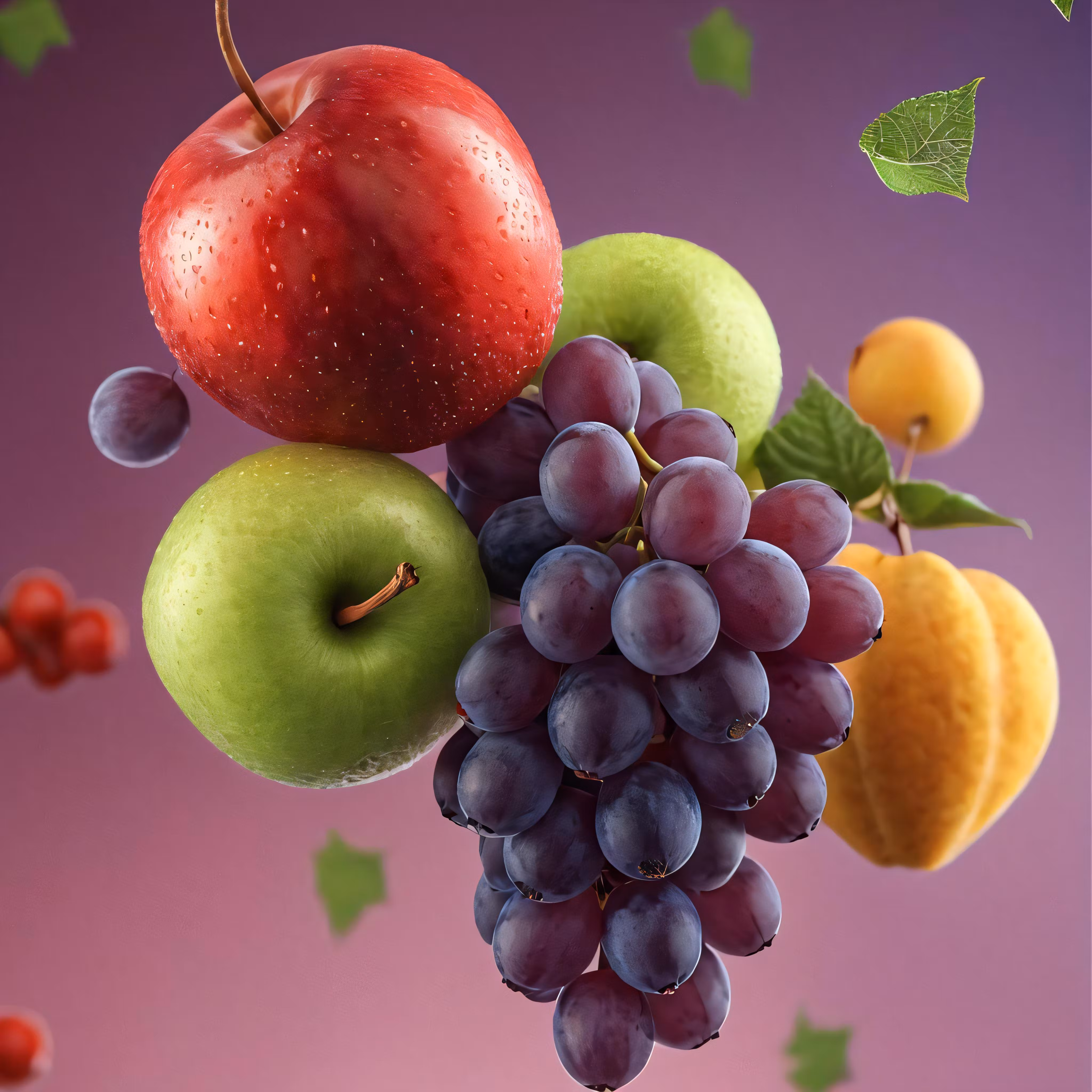 High resolution picture, free to use, some fruits are flying through the air with their stems