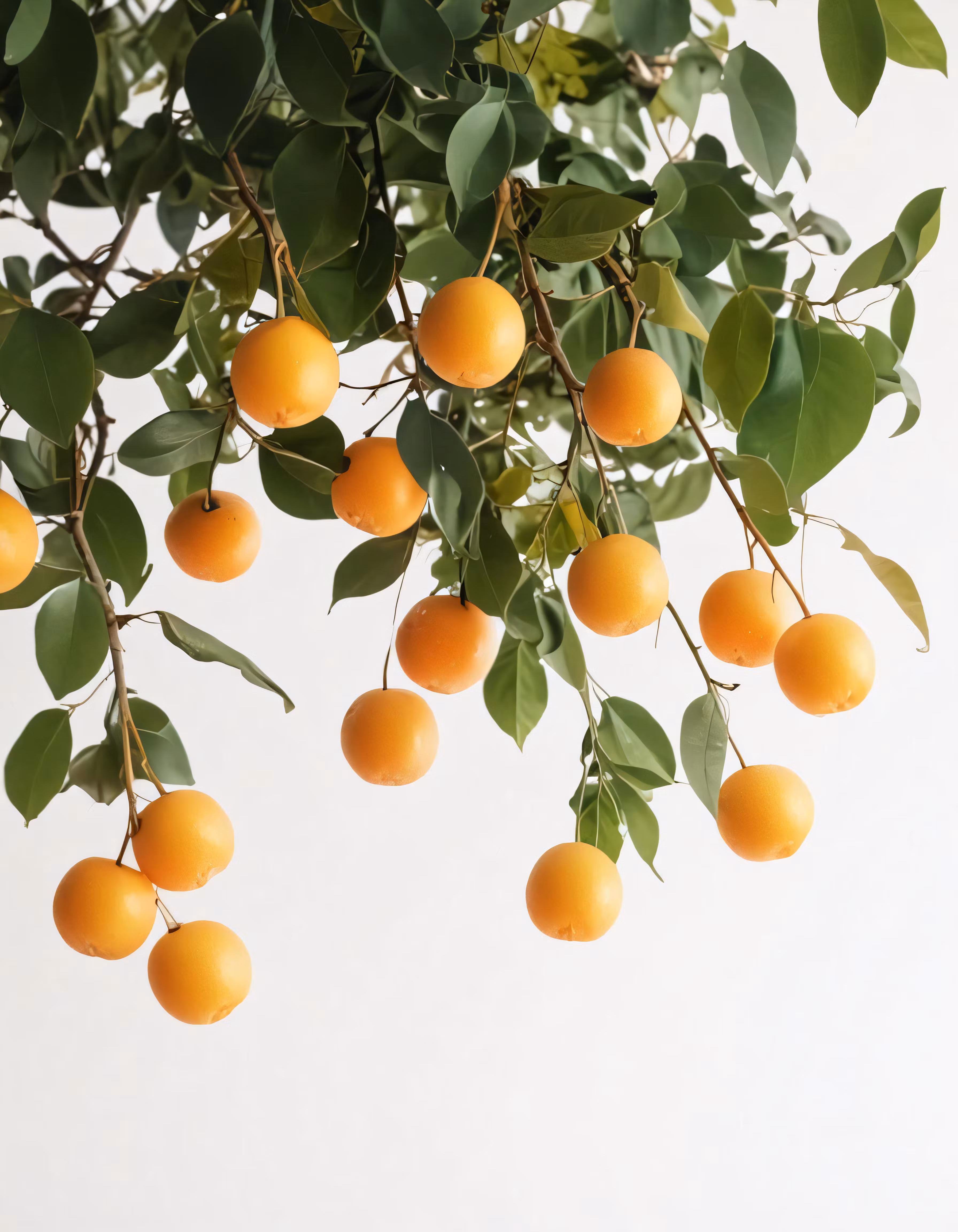 High resolution picture, free to use, some oranges on a tree branch in front of a white background