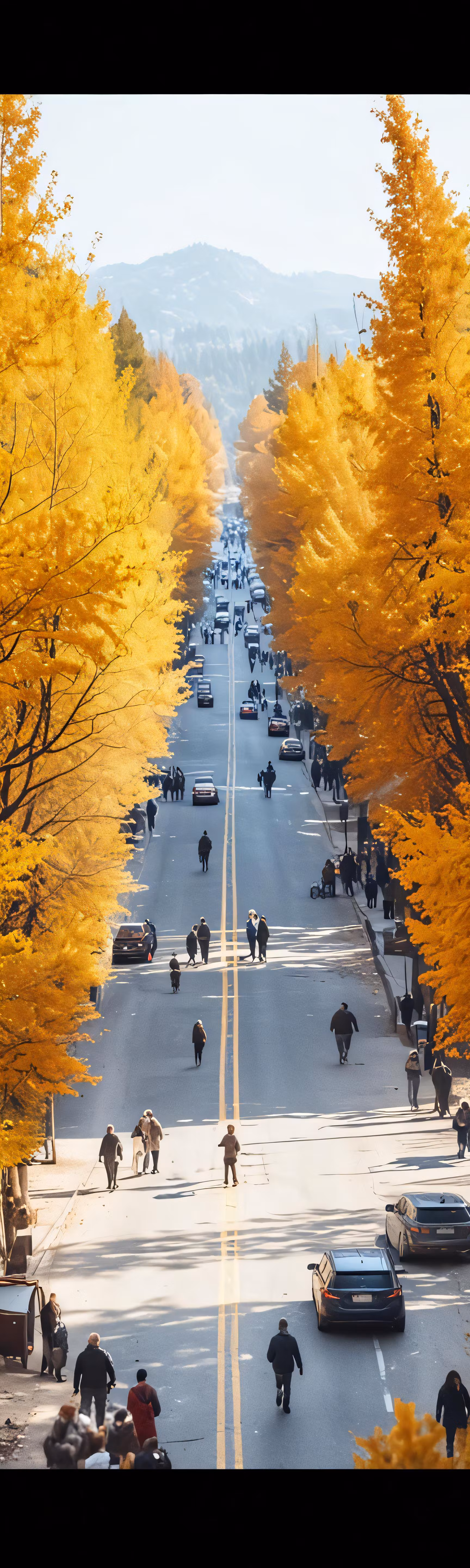 High resolution picture, free to use, some people are walking down a road while trees show their fall colors