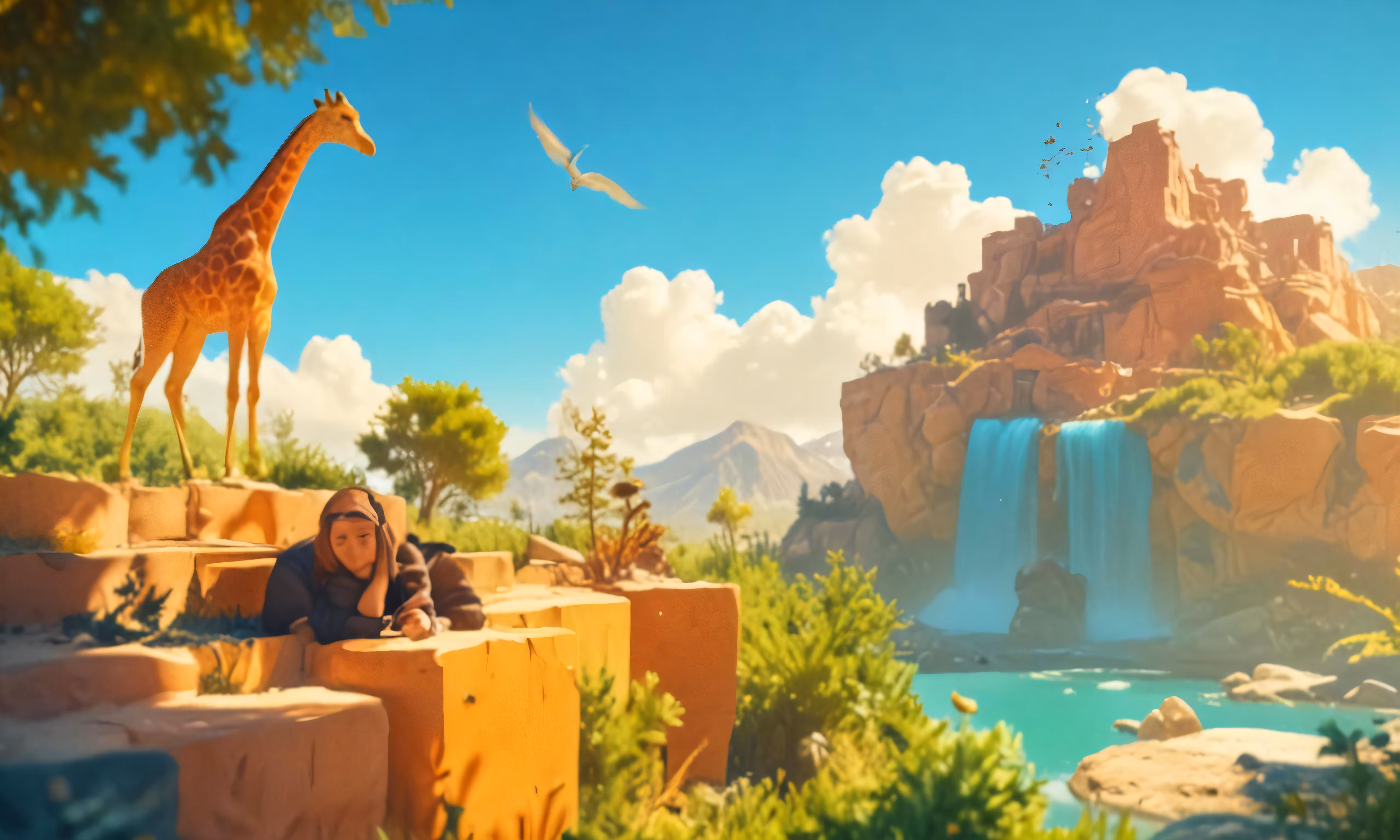 High resolution picture, free to use, some people on steps near a water fall and giraffe
