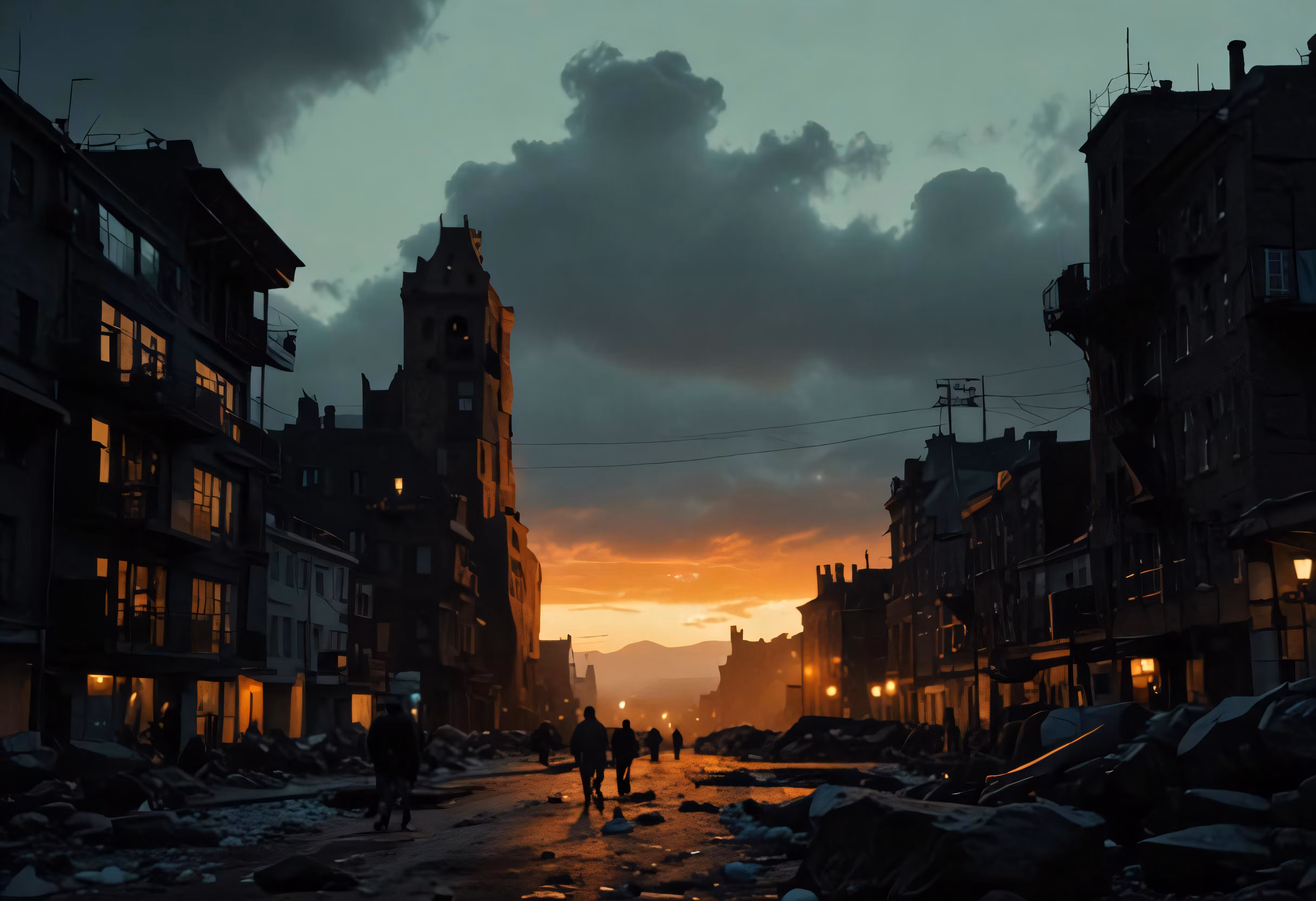 High resolution picture, free to use, some people walking down a wet street at sunset