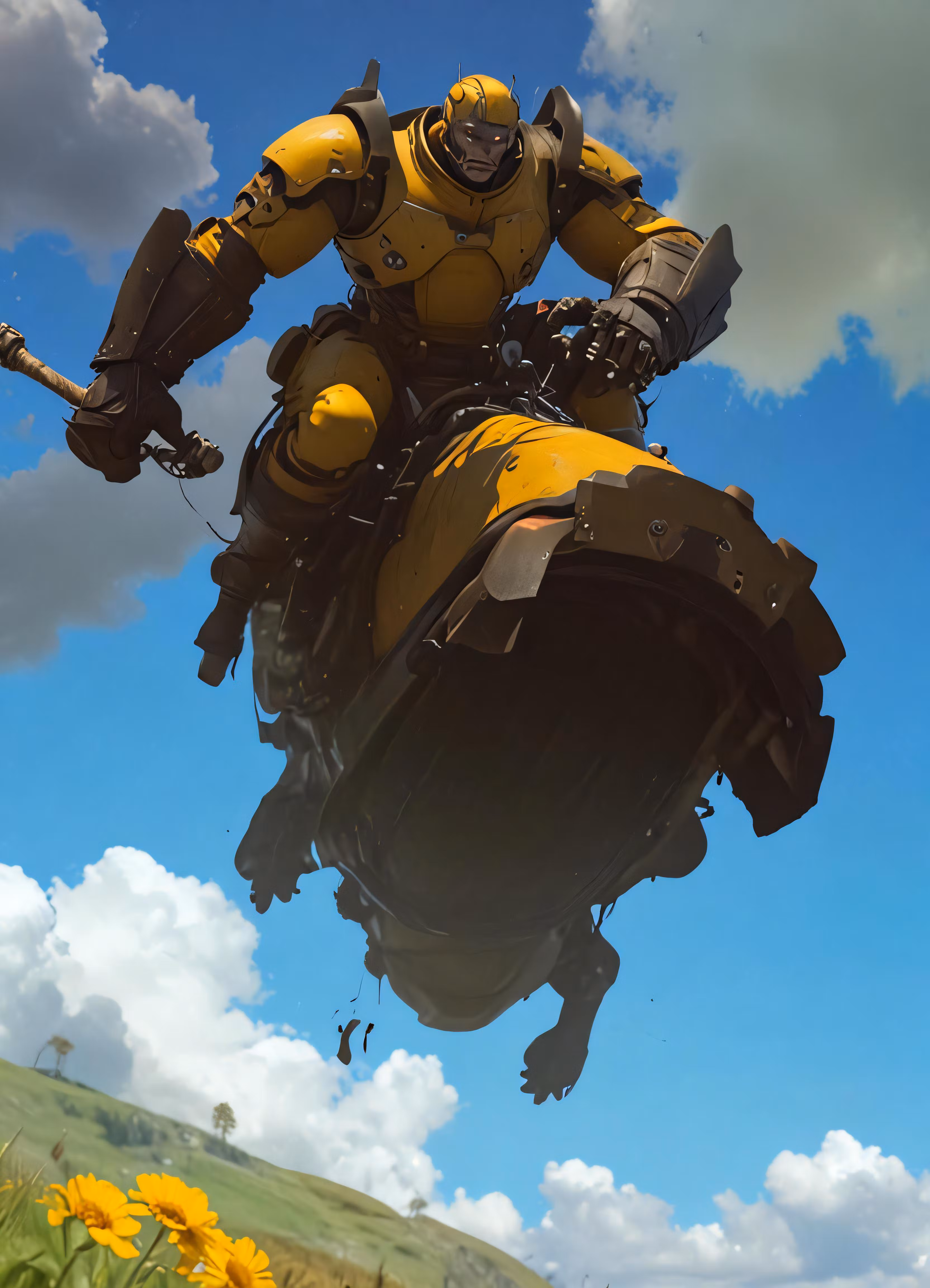 High resolution picture, free to use, some sort of futuristic looking mechanical man standing above a sunflower field