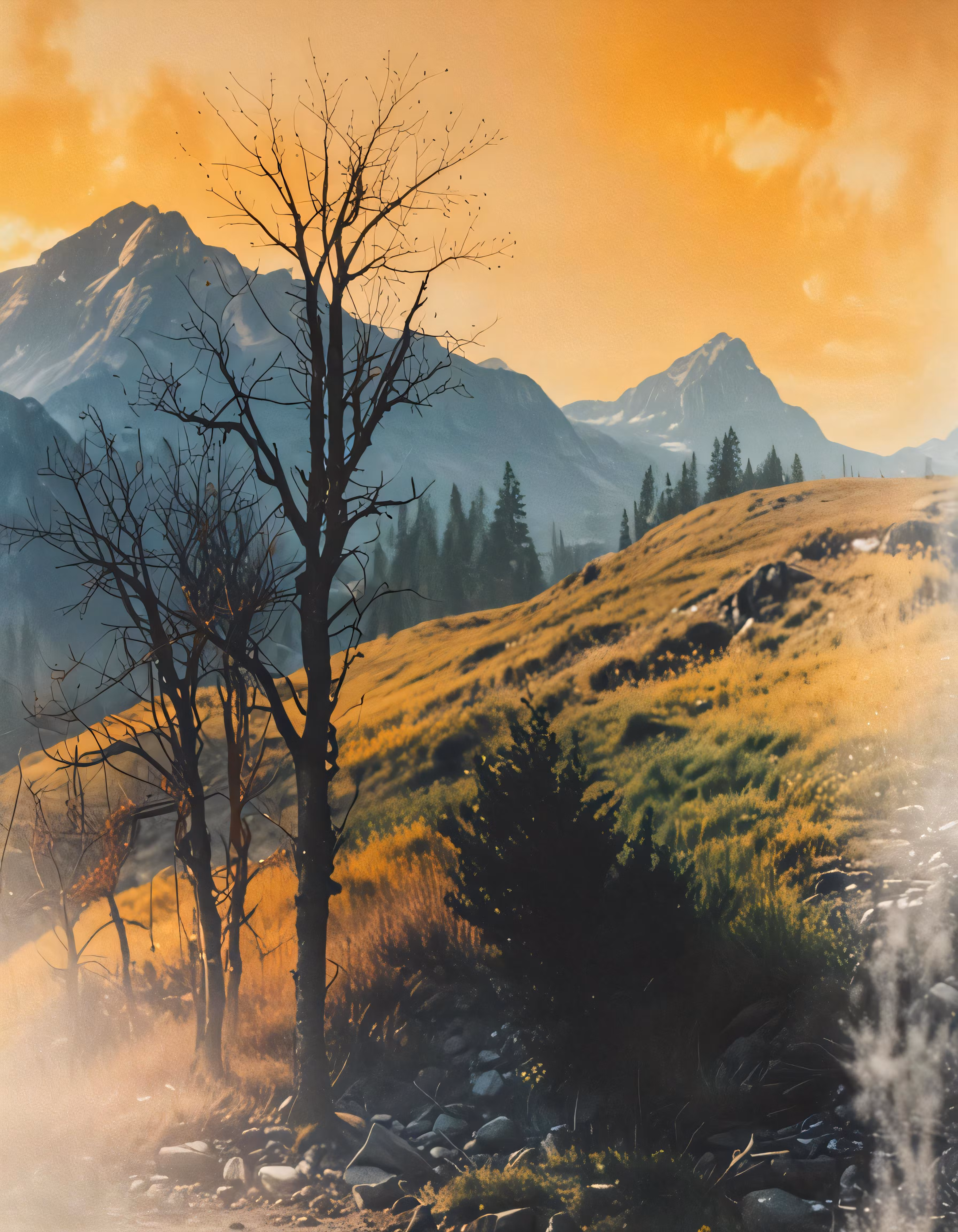 High resolution picture, free to use, some trees on a hill with mountains in the distance
