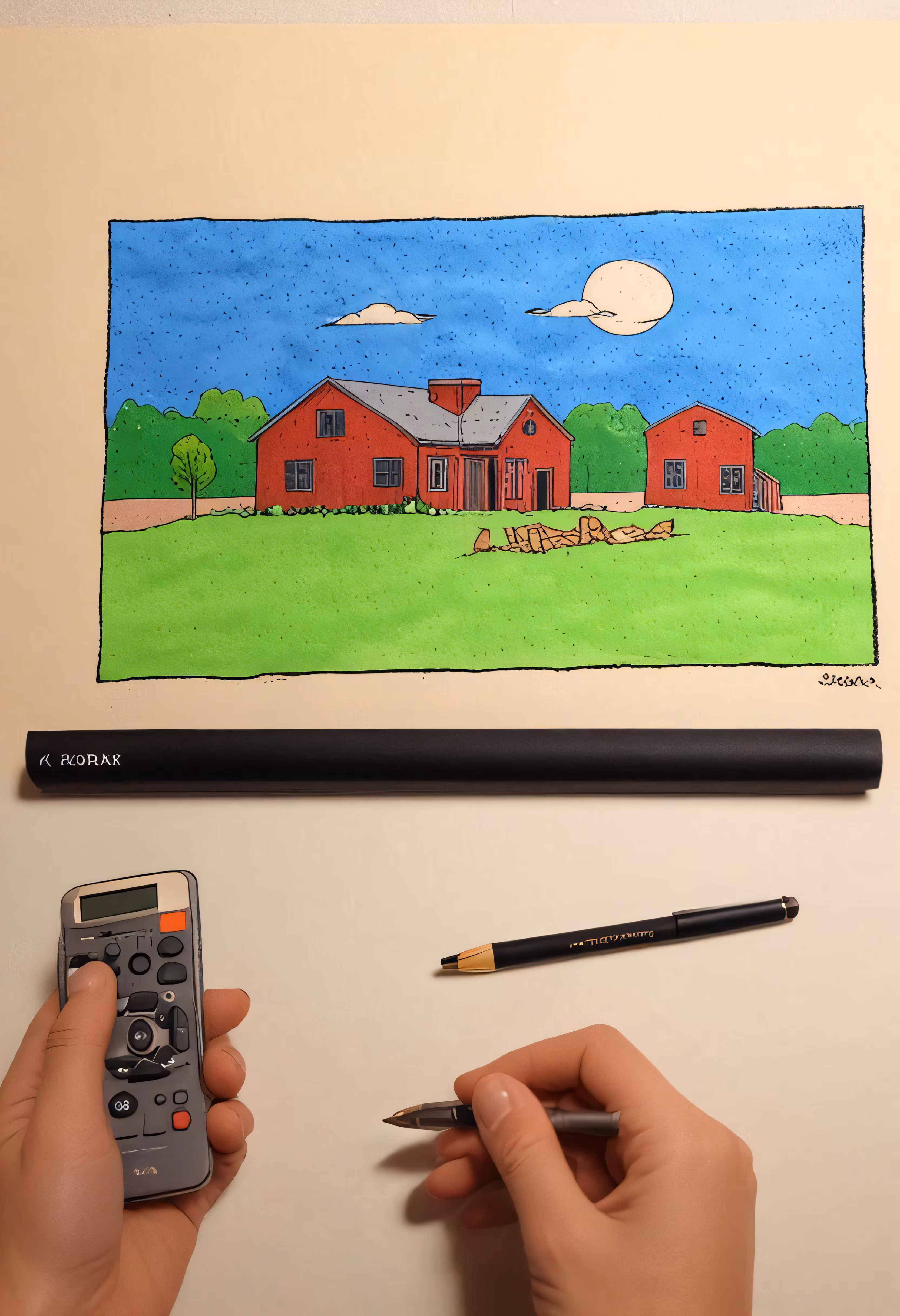 High resolution picture, free to use, someone drawing a farm house in front of a large picture