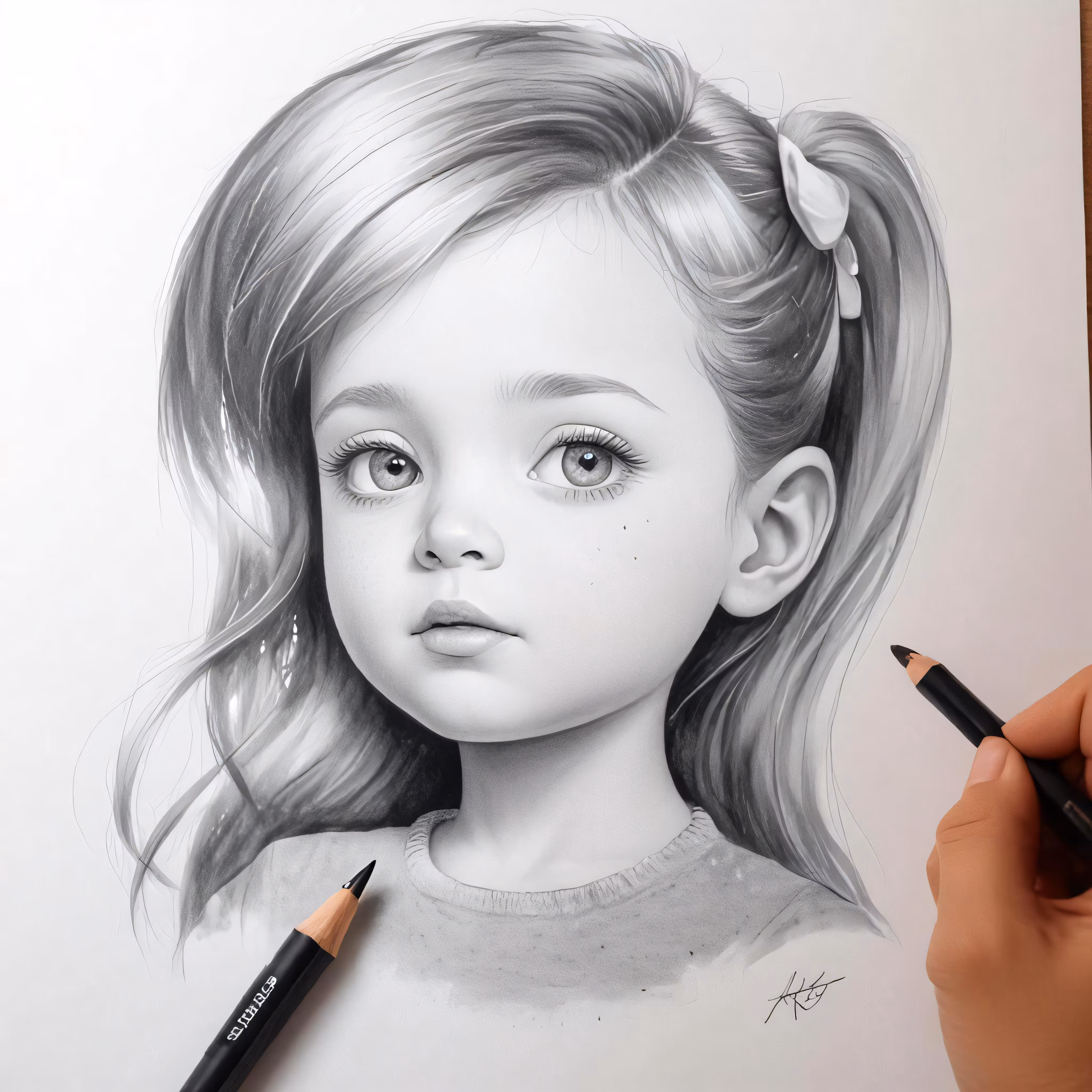 High resolution picture, free to use, someone has finished a portrait of their child, using a colored pencil