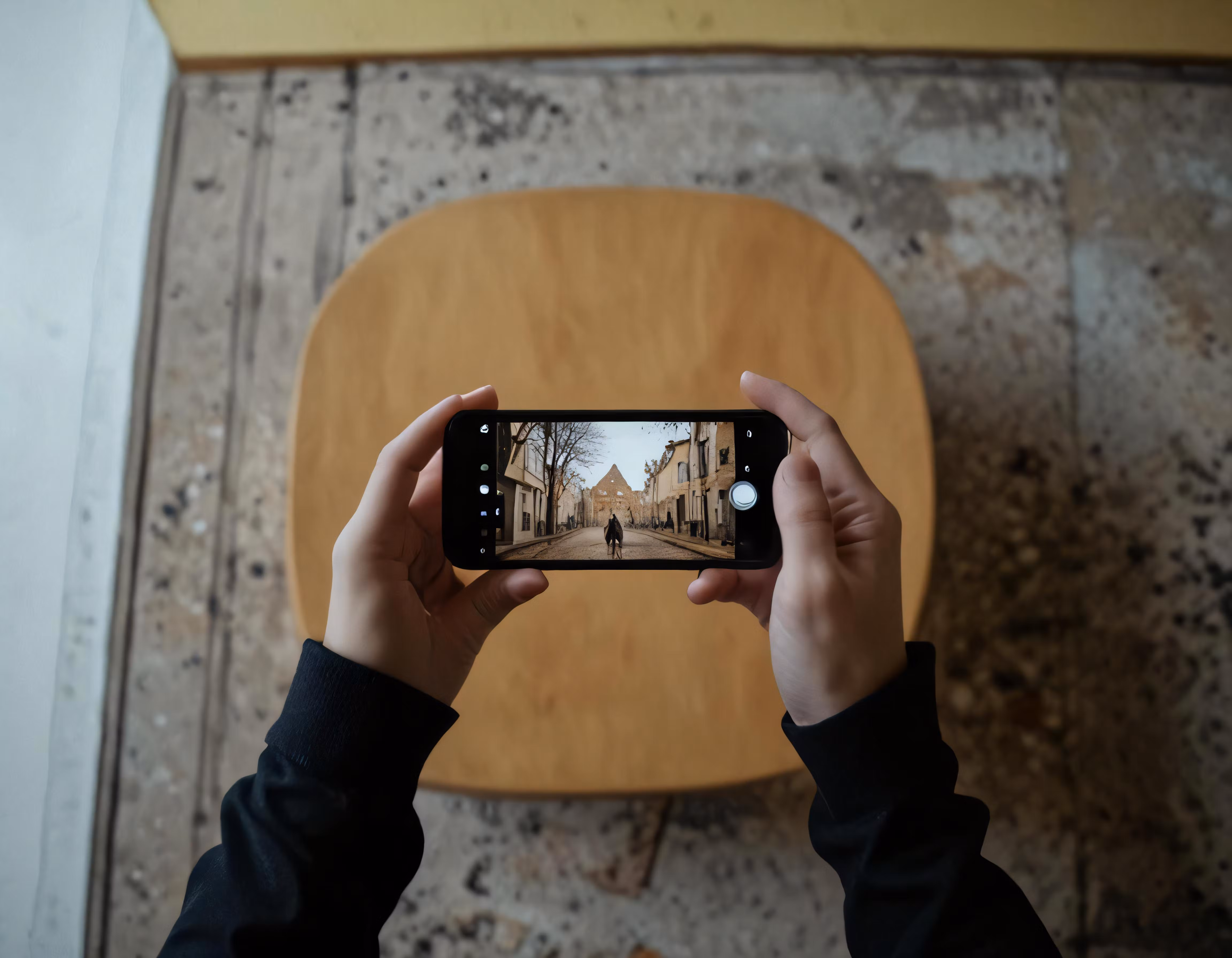 High resolution picture, free to use, someone holding a camera with their cell phone near a table