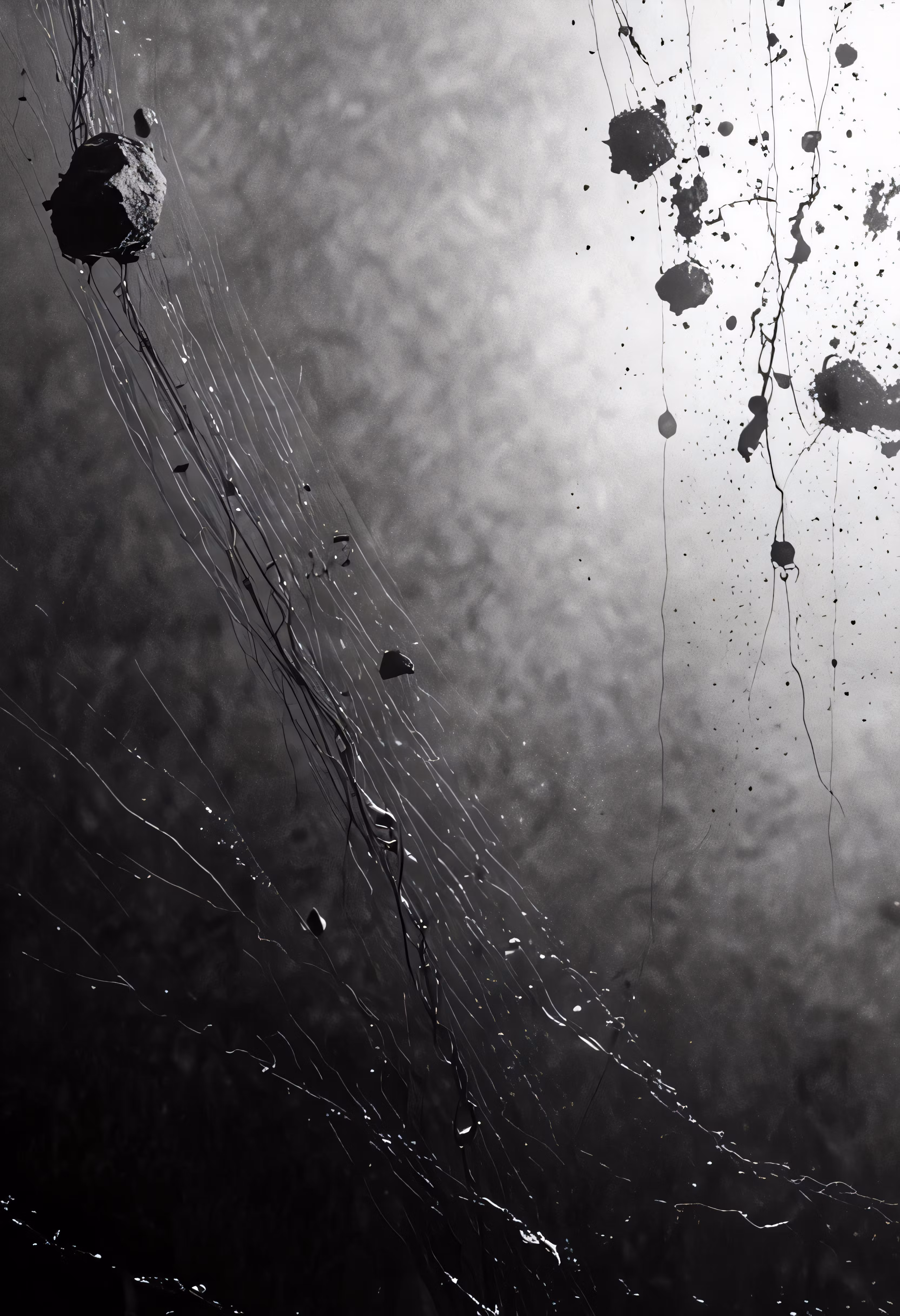 High resolution picture, free to use, spider webs and drops of water against a black and white background