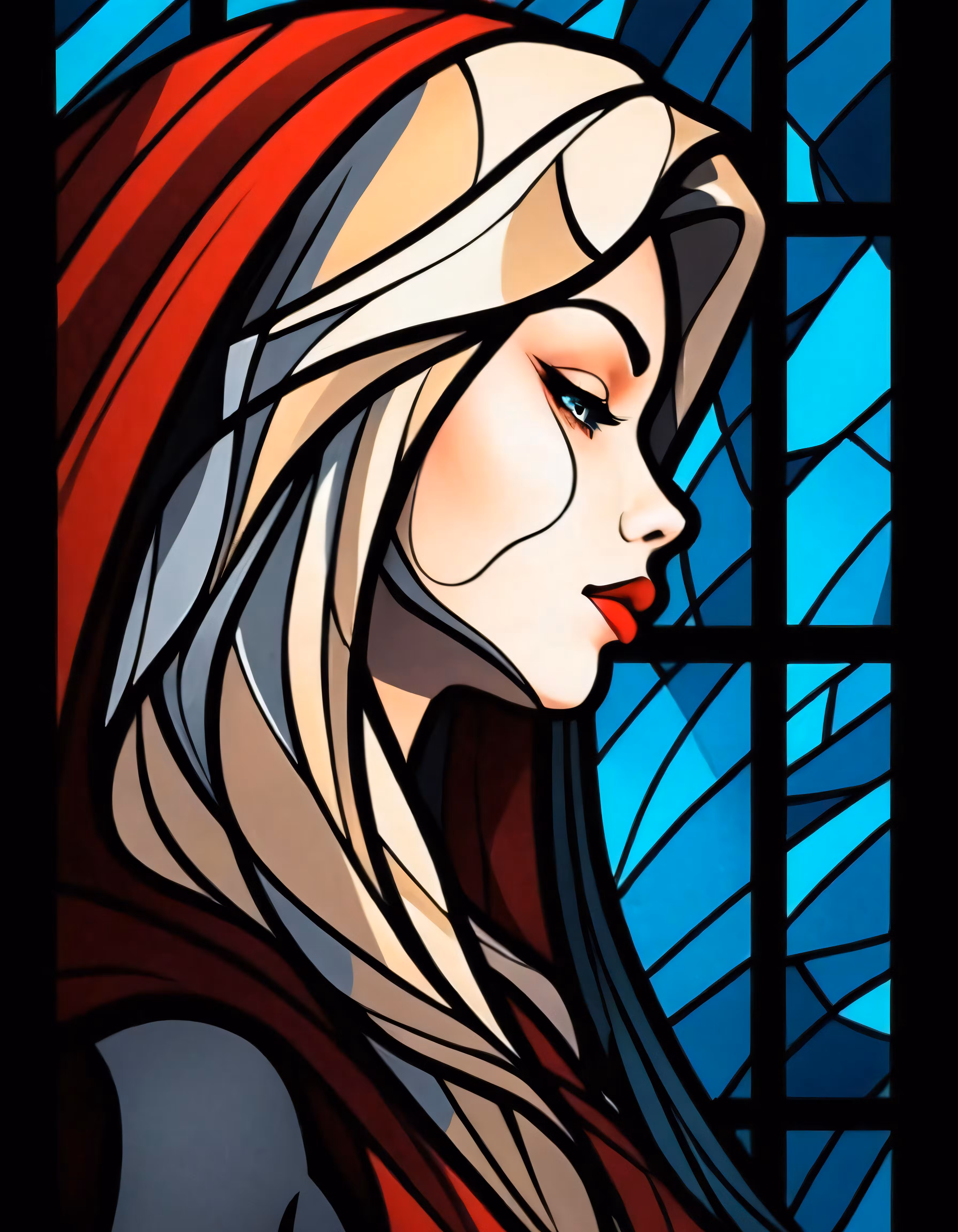 High resolution picture, free to use, stained glass portrait of a lady wearing a red coat