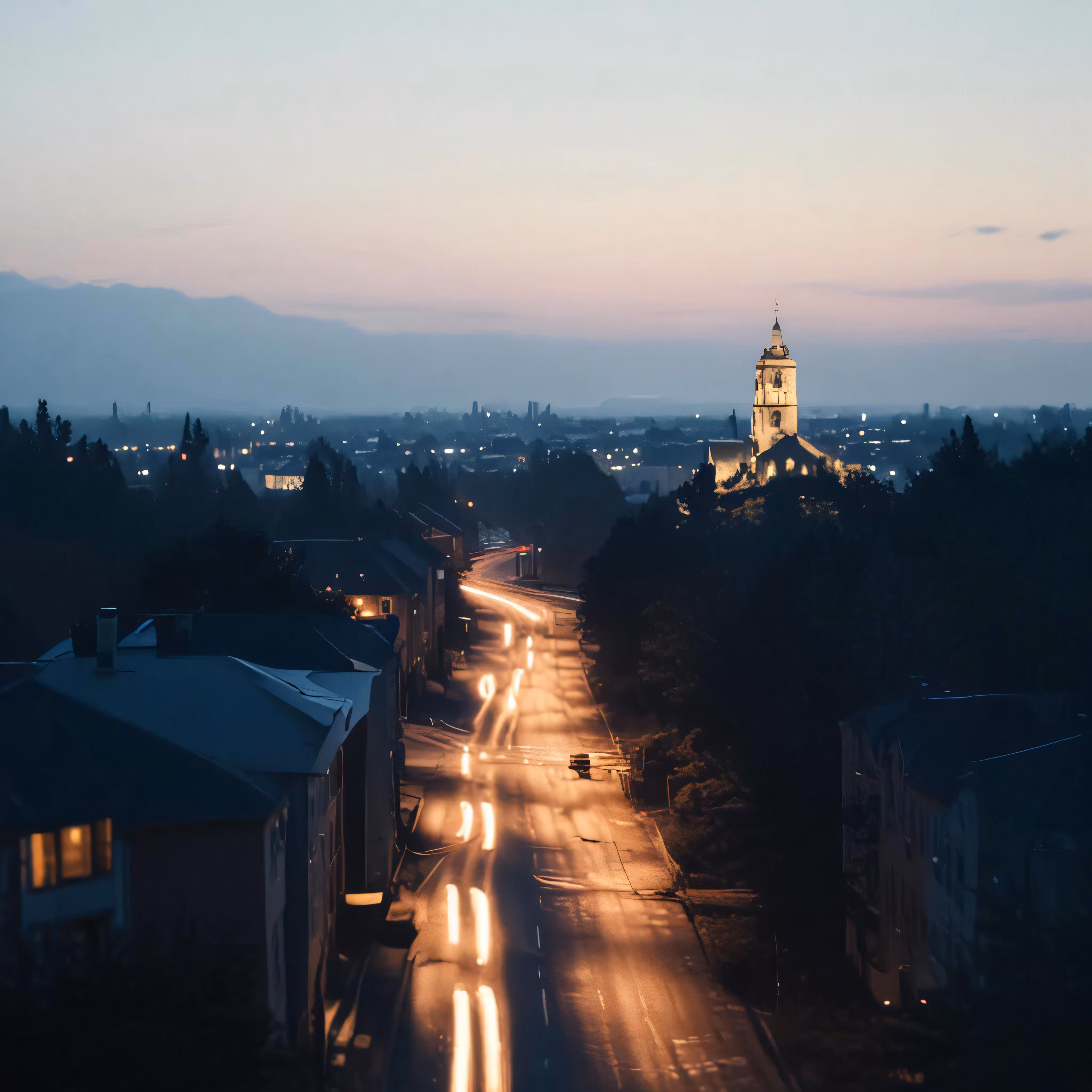 High resolution picture, free to use, street lights are streaking along the buildings, with a town in the distance