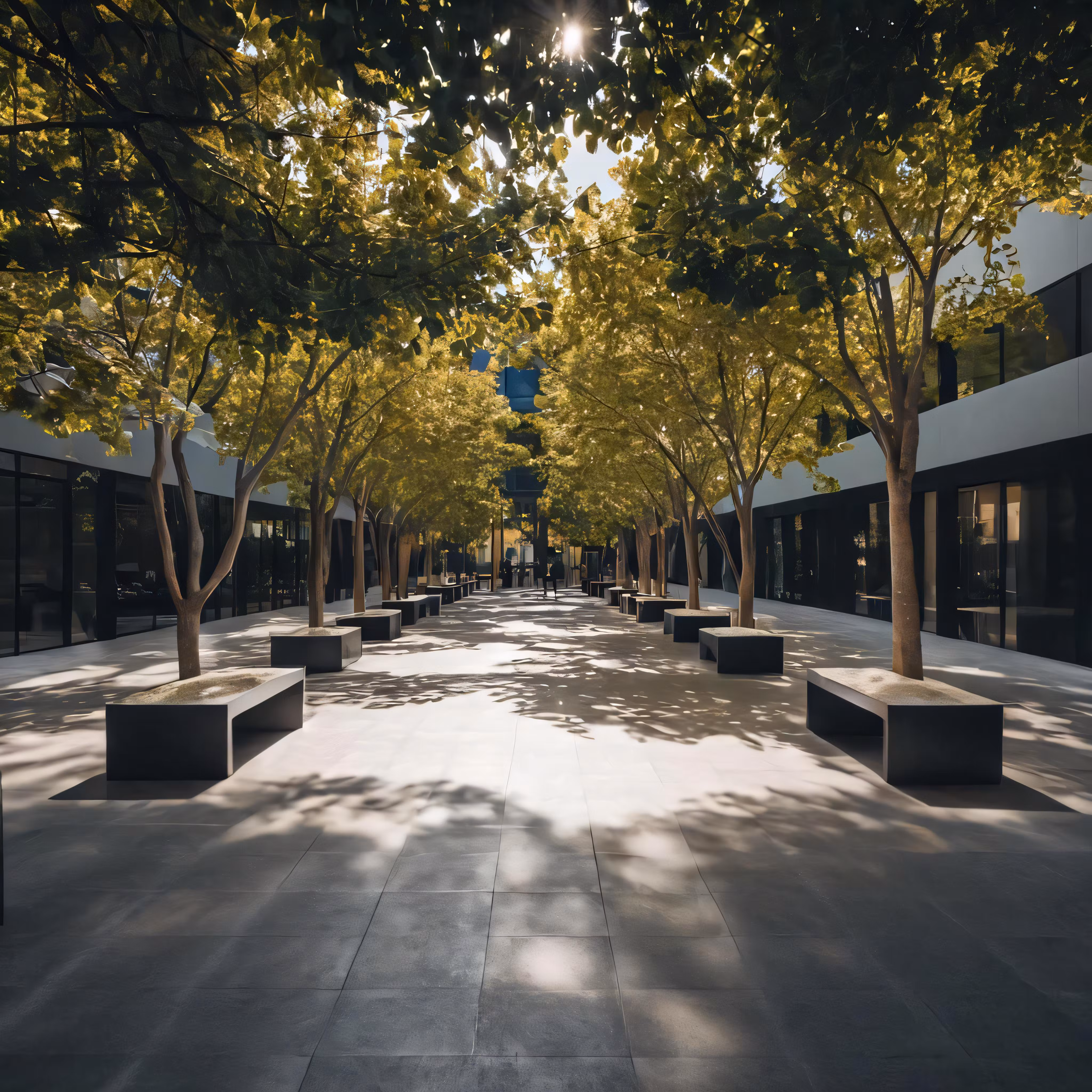 High resolution picture, free to use, sun reflecting off trees onto the side of a street