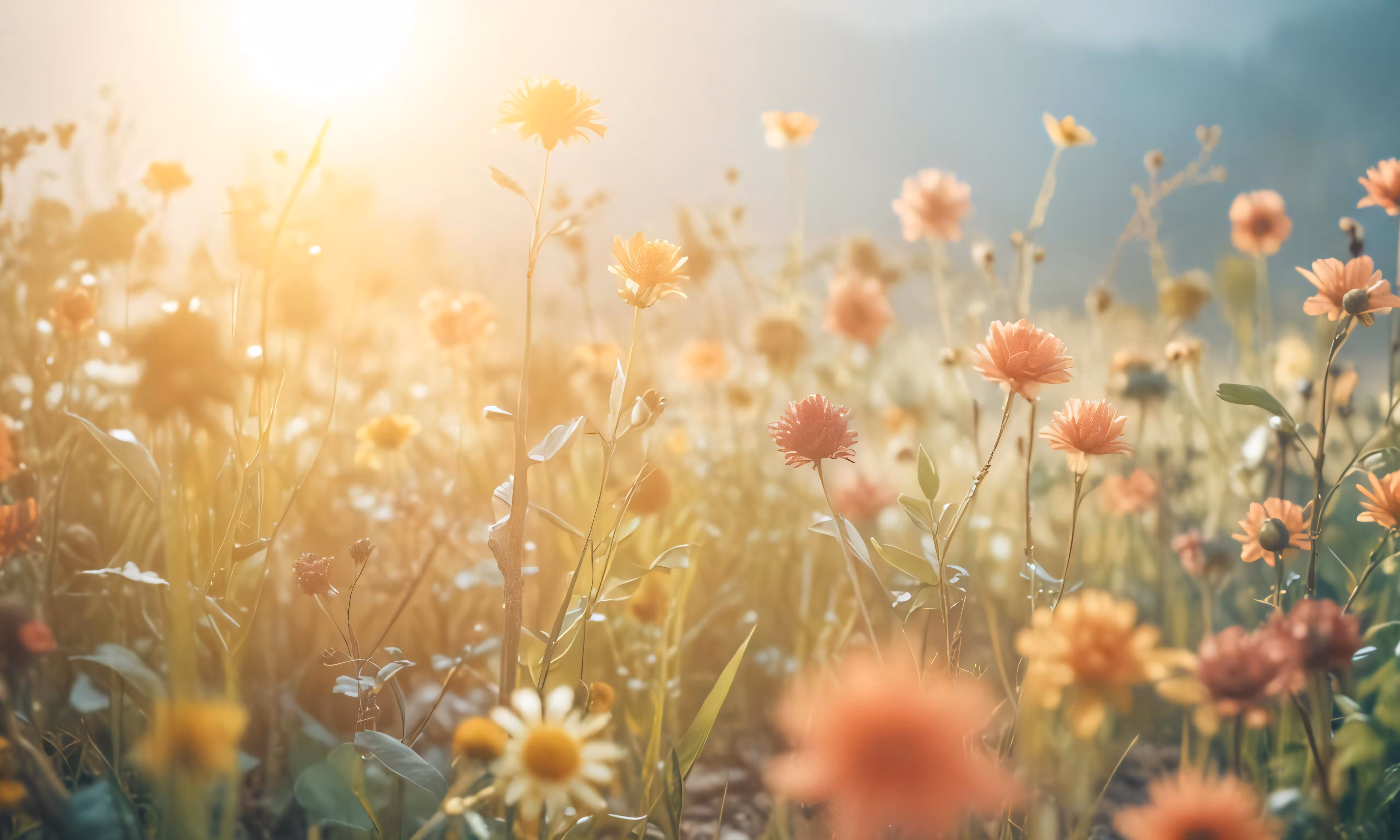 High resolution picture, free to use, sun shining through daisies in the middle of a field