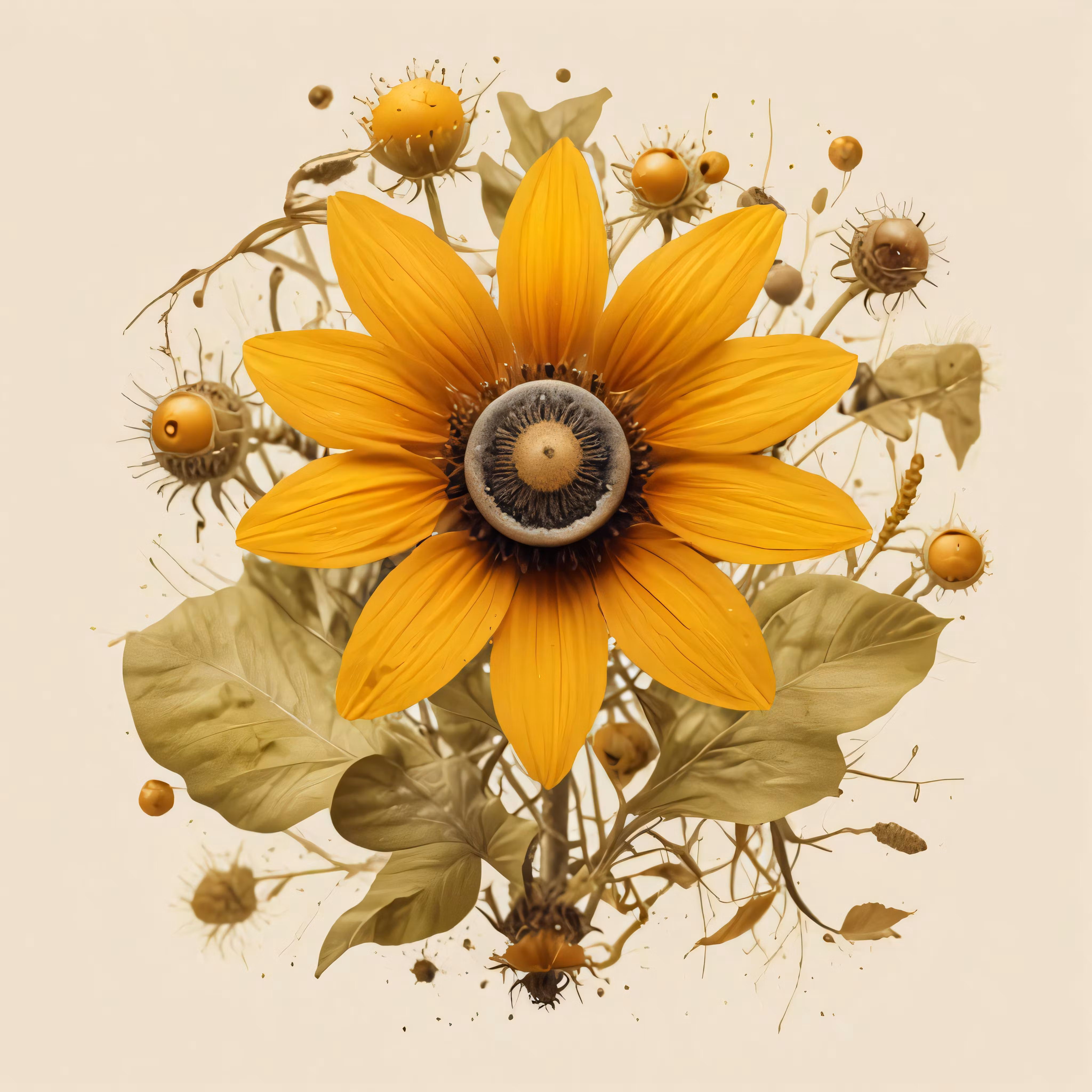 High resolution picture, free to use, sunflower with several leaves, seeds and flowers on a white background