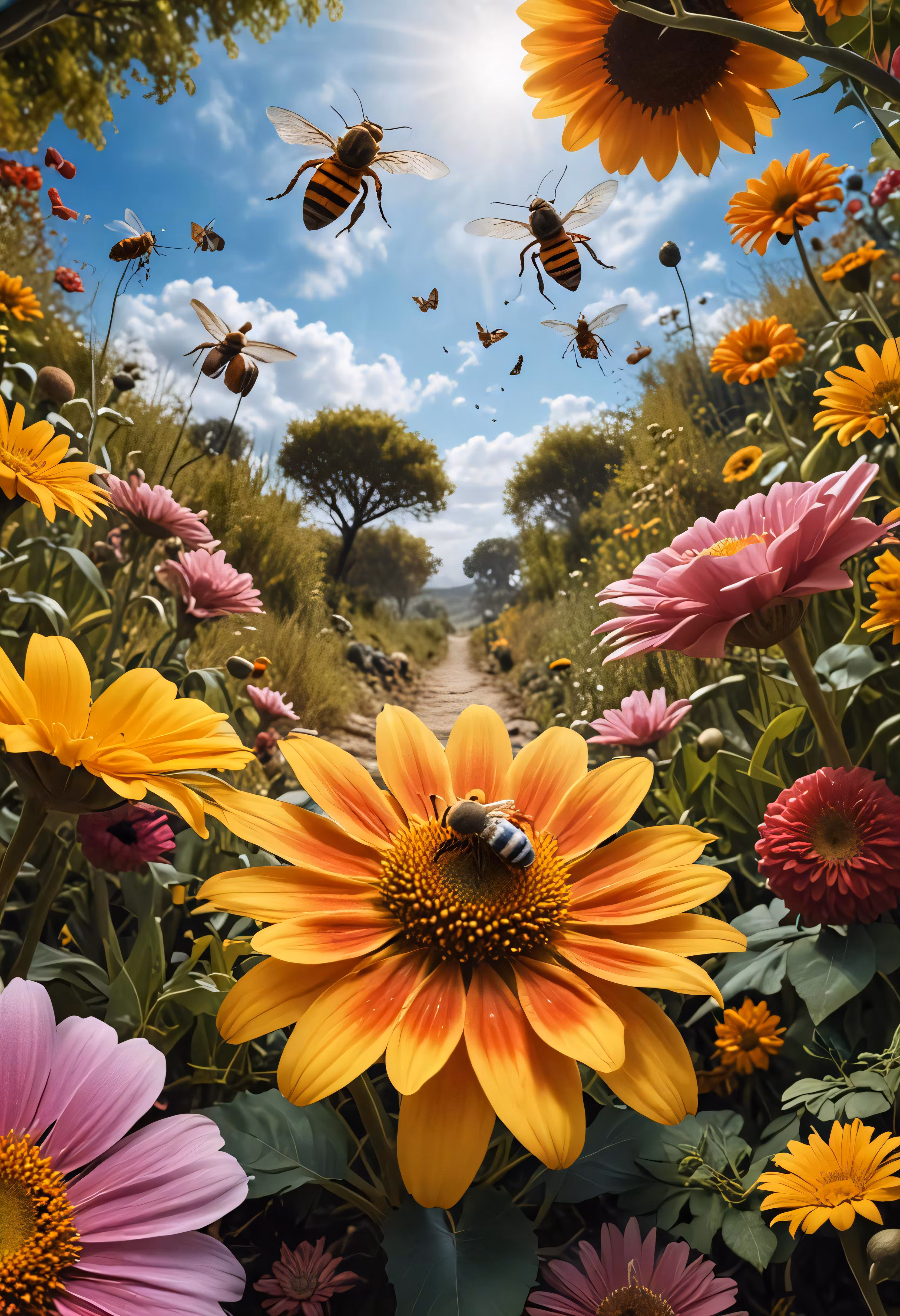 High resolution picture, free to use, sunflowers, bees, and other flowers all featured in this image