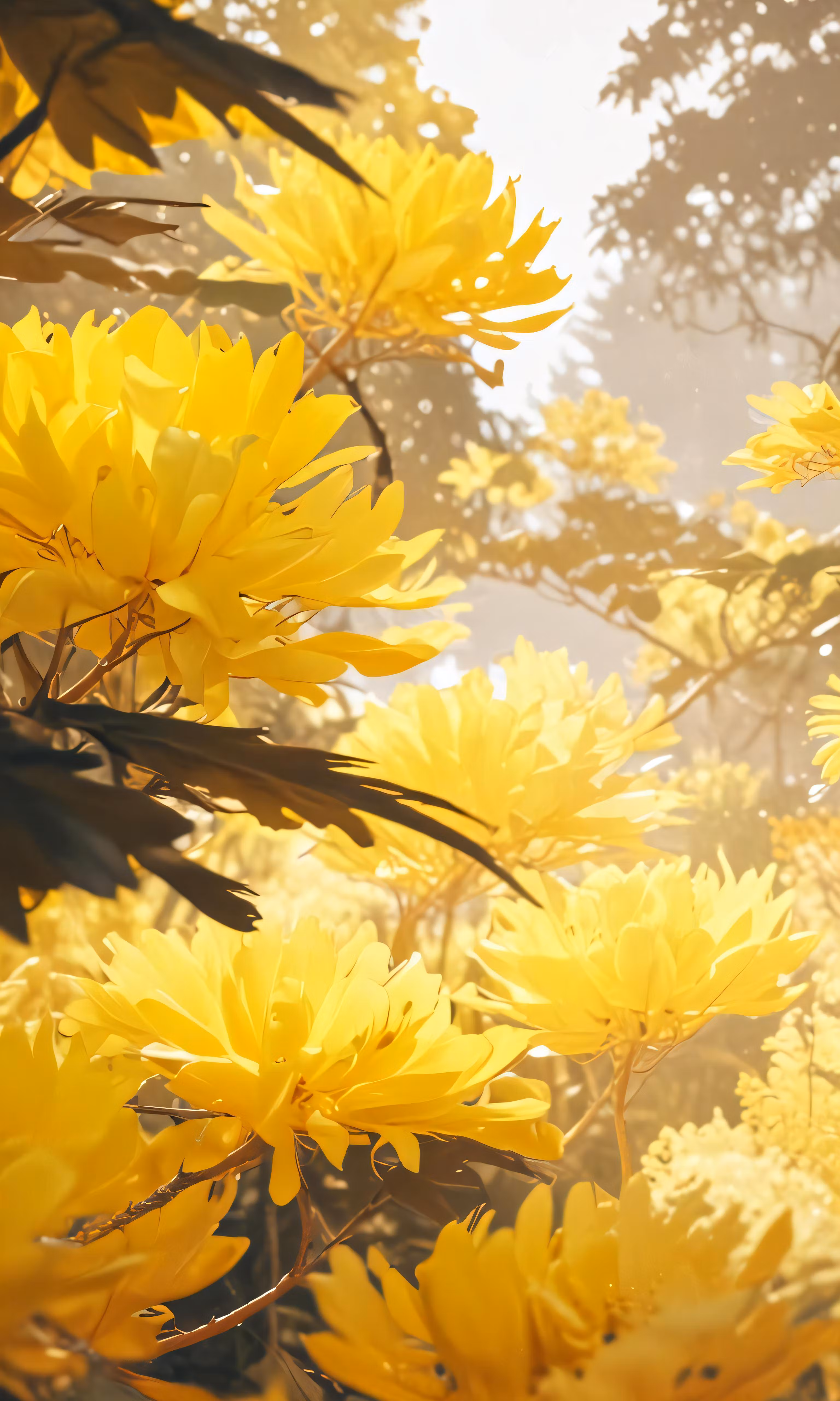 High resolution picture, free to use, sunlight is reflected off of yellow flowers and leaves