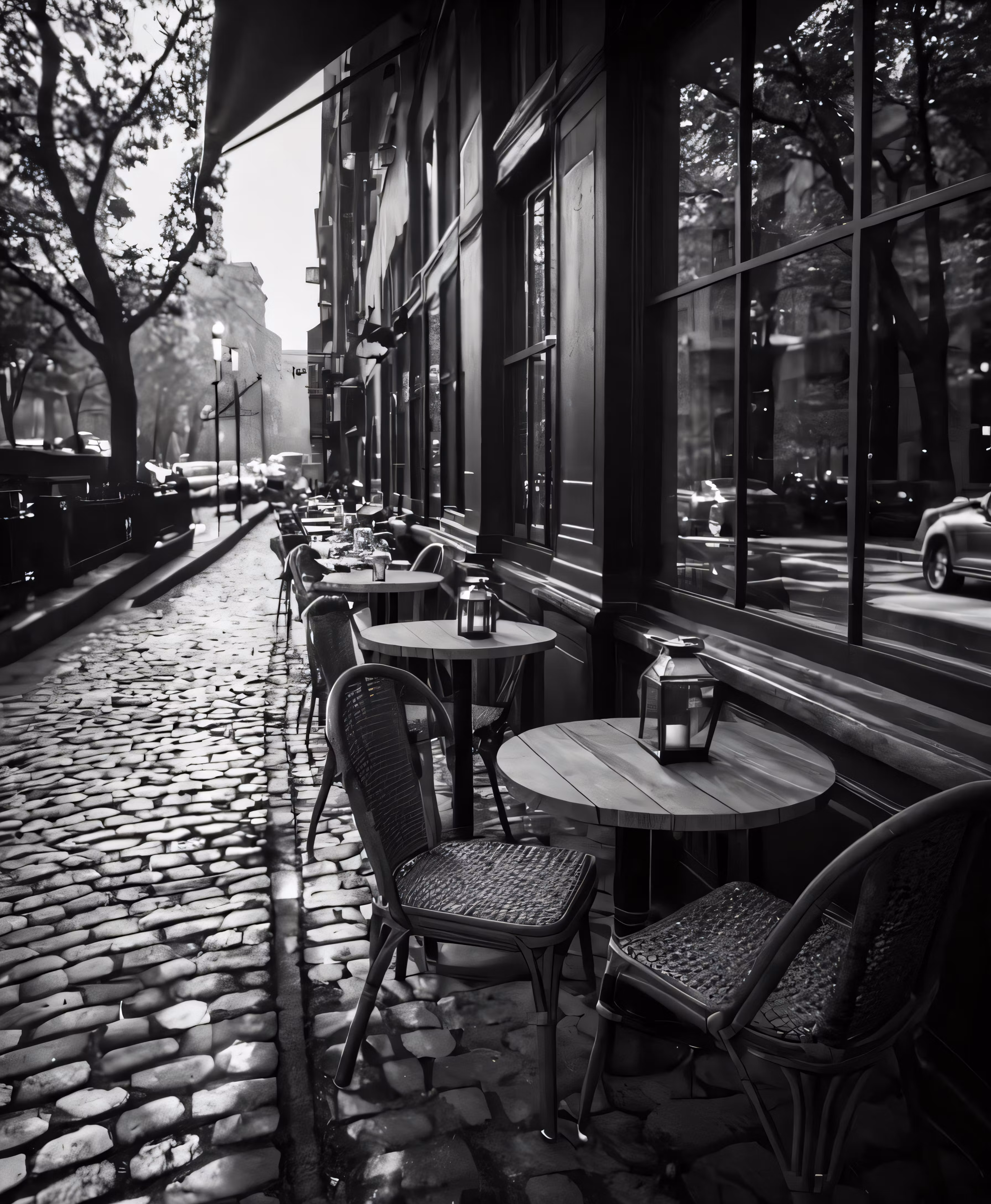 High resolution picture, free to use, tables and chairs in a cobble stone road outside a restaurant