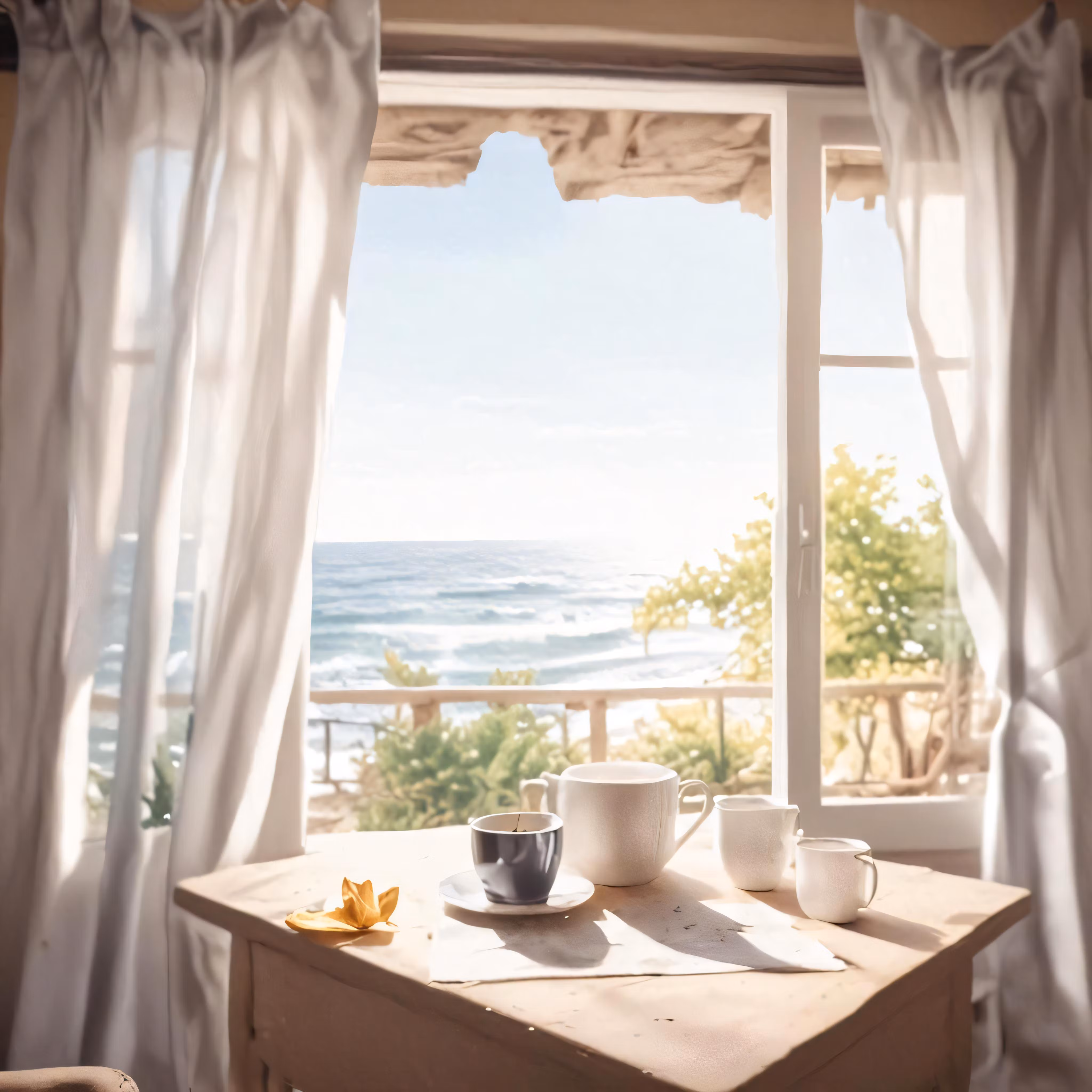 High resolution picture, free to use, tea and coffee cup on a desk near open windows overlooking the water