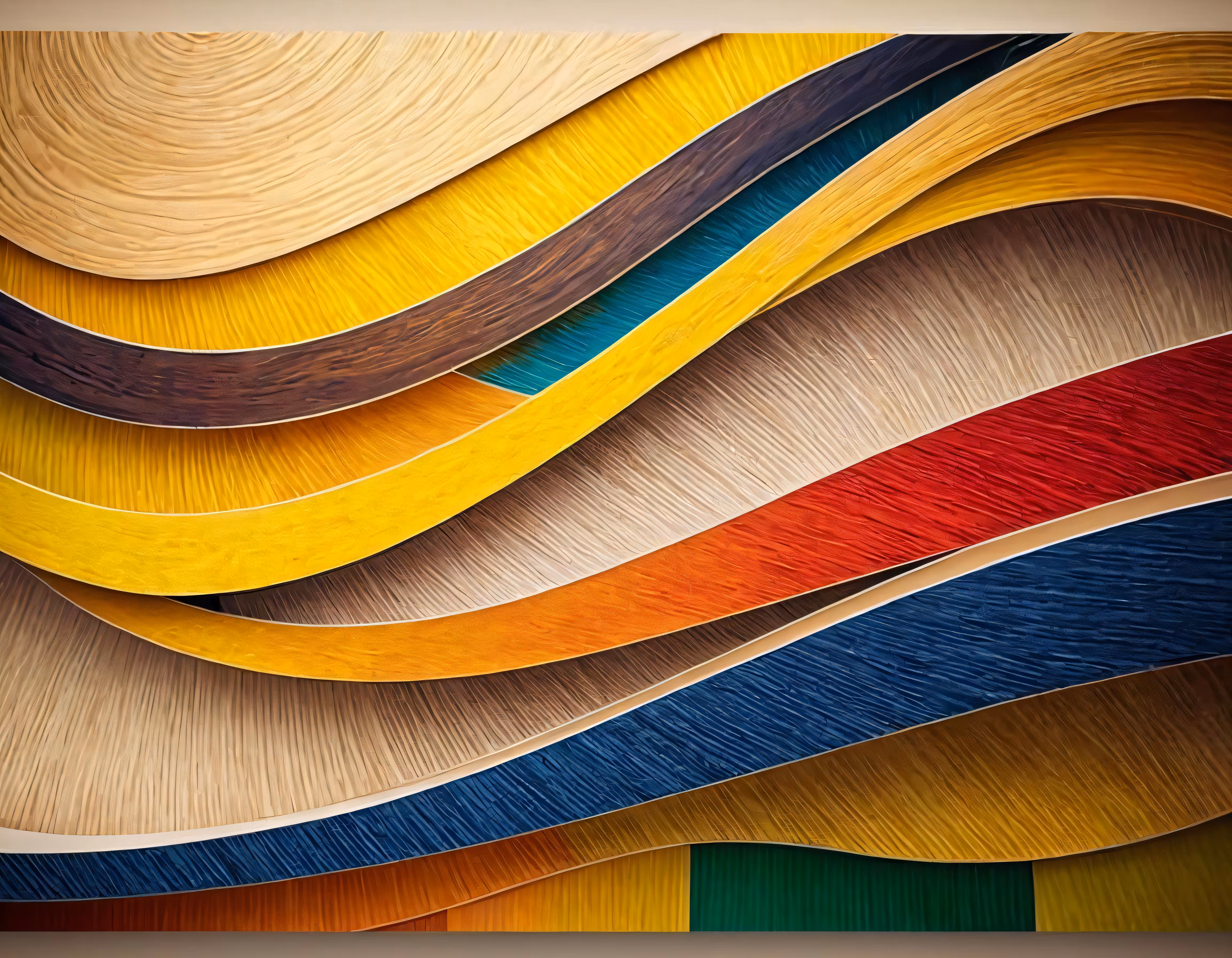 High resolution picture, free to use, the abstract image shows a row of wavy wood strips, with colors in a series of four, in multi   colored, curved lines