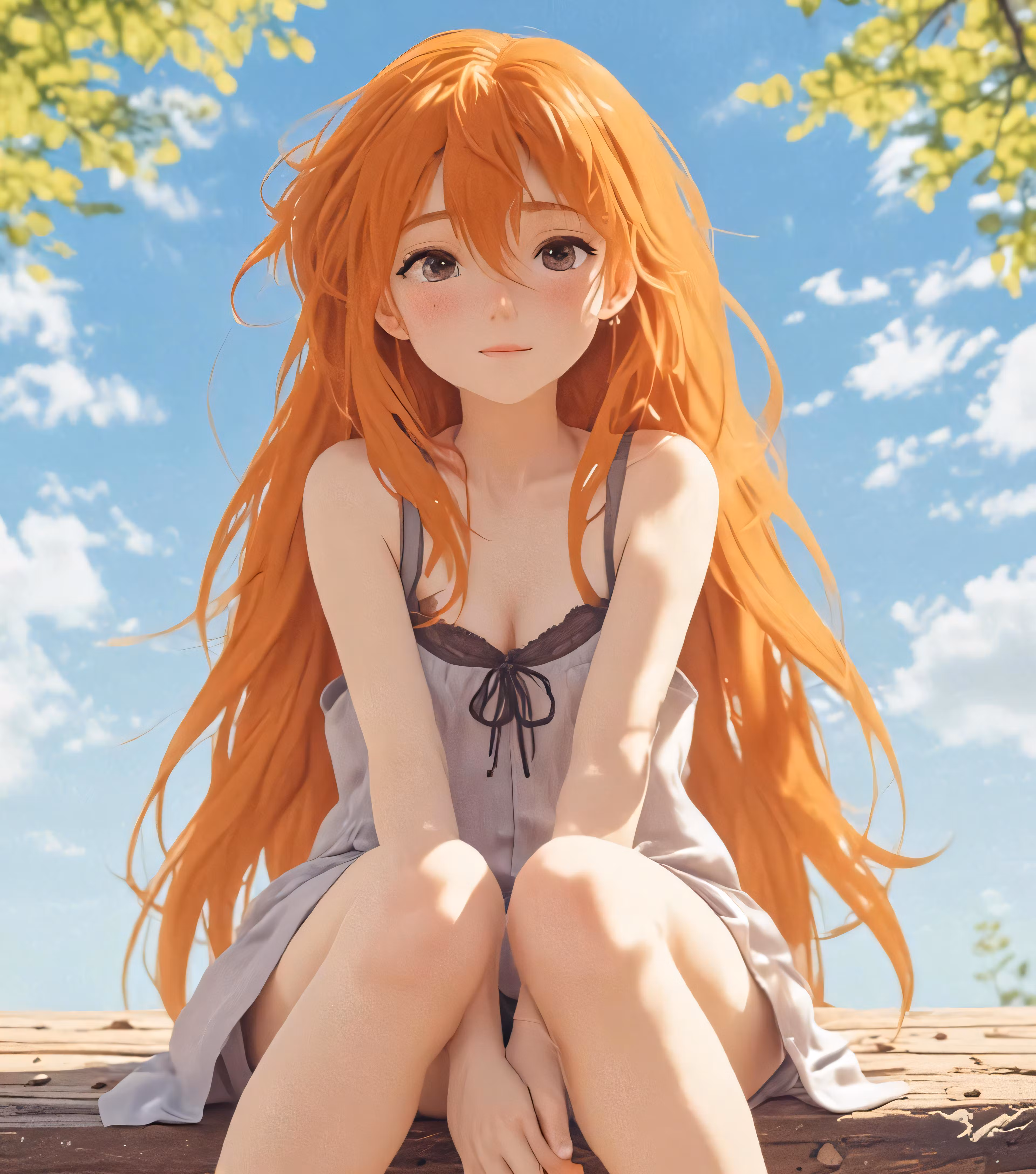 High resolution picture, free to use, the anime character has orange hair and is sitting on a piece of wood