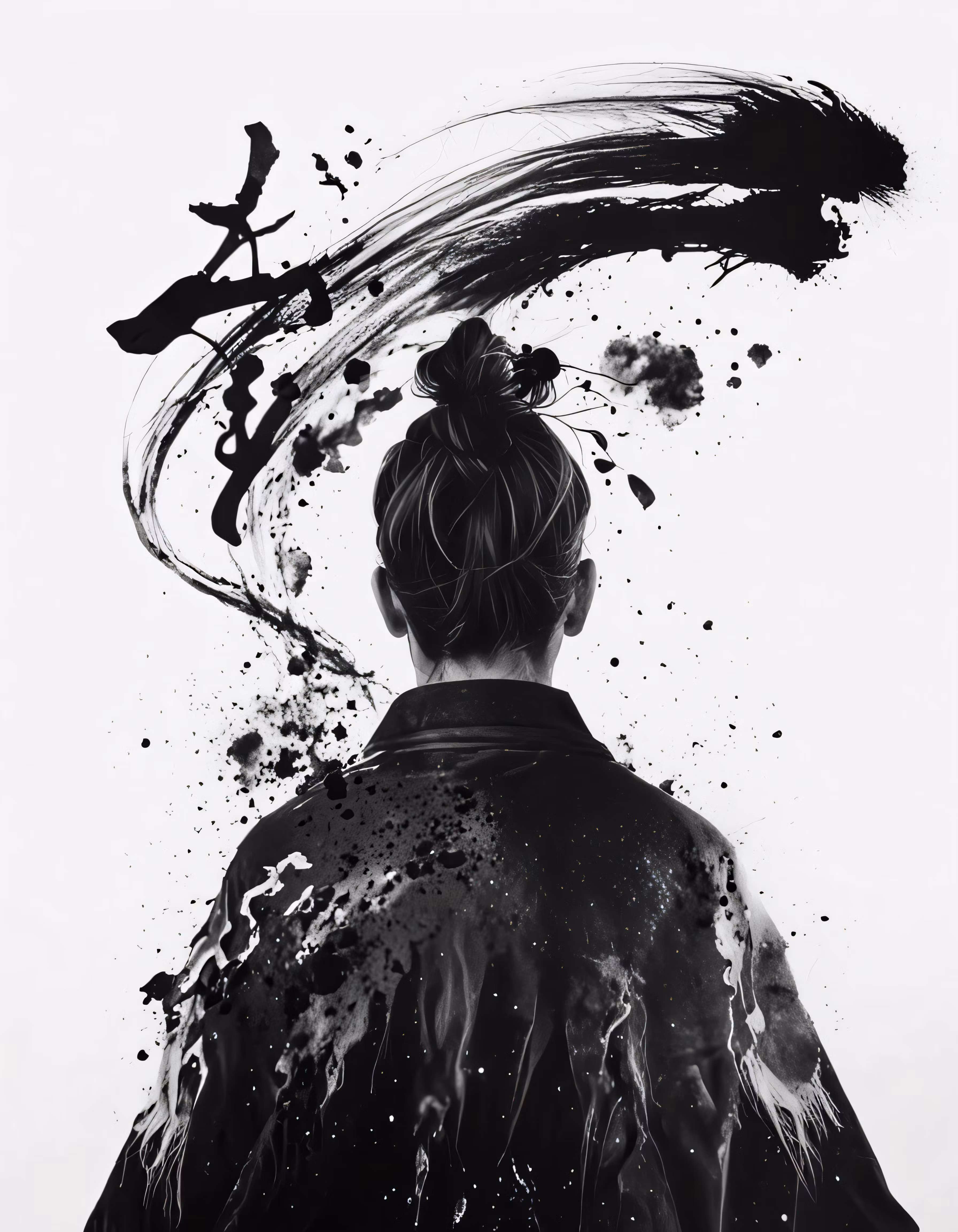 High resolution picture, free to use, the back of an asian woman with a black and white painting on it