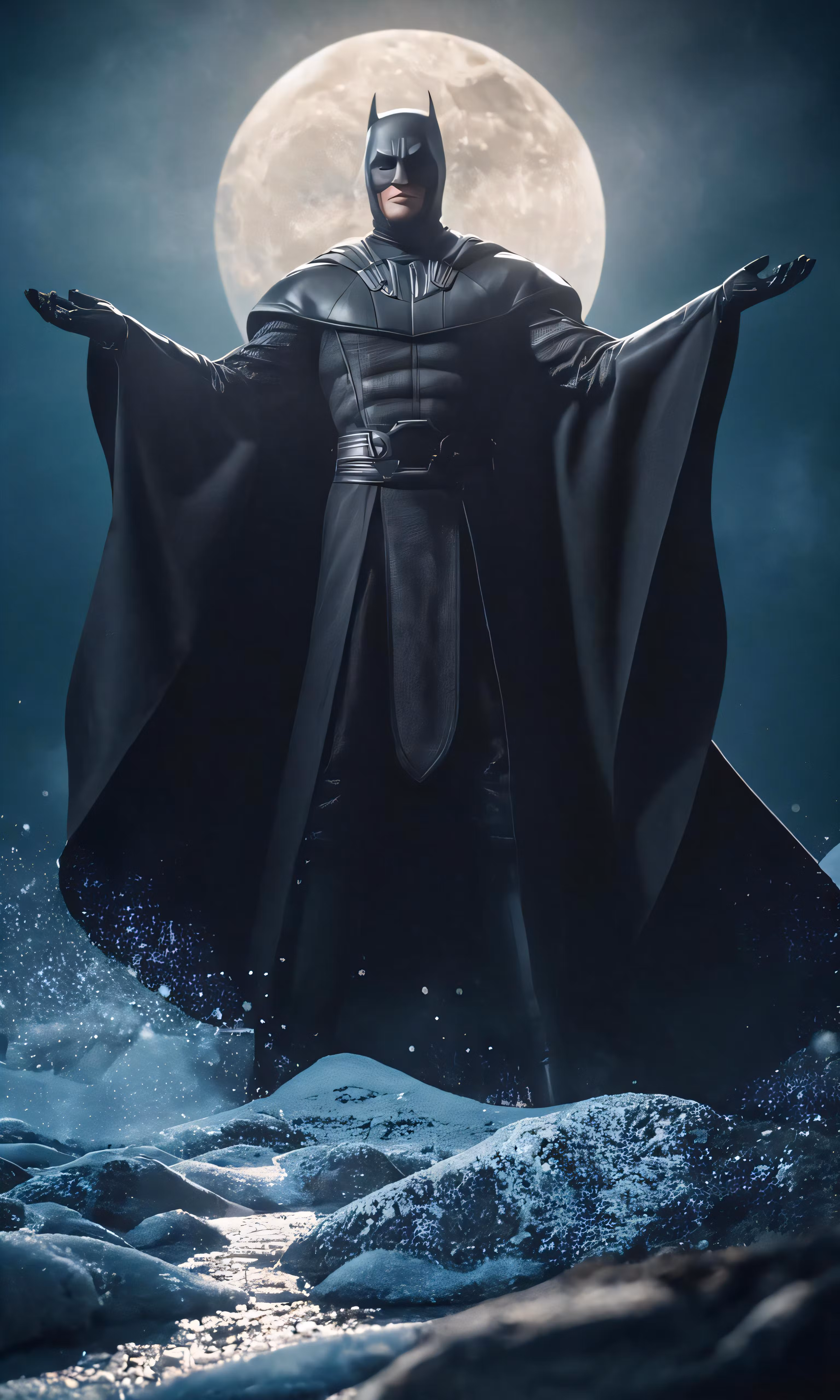 High resolution picture, free to use, the batman is standing in water with his hands out