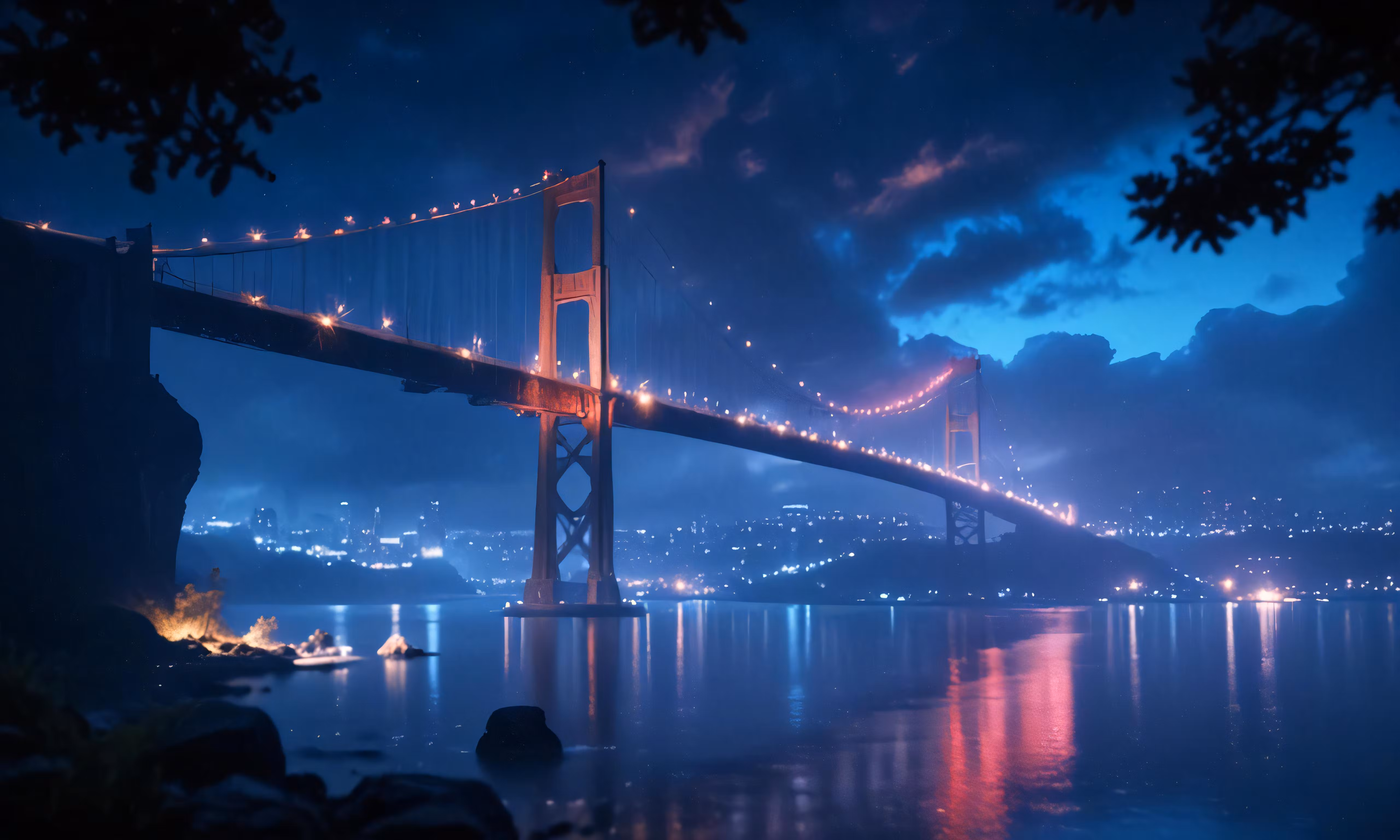 High resolution picture, free to use, the bay bridge is lit up at night as viewed from across the river