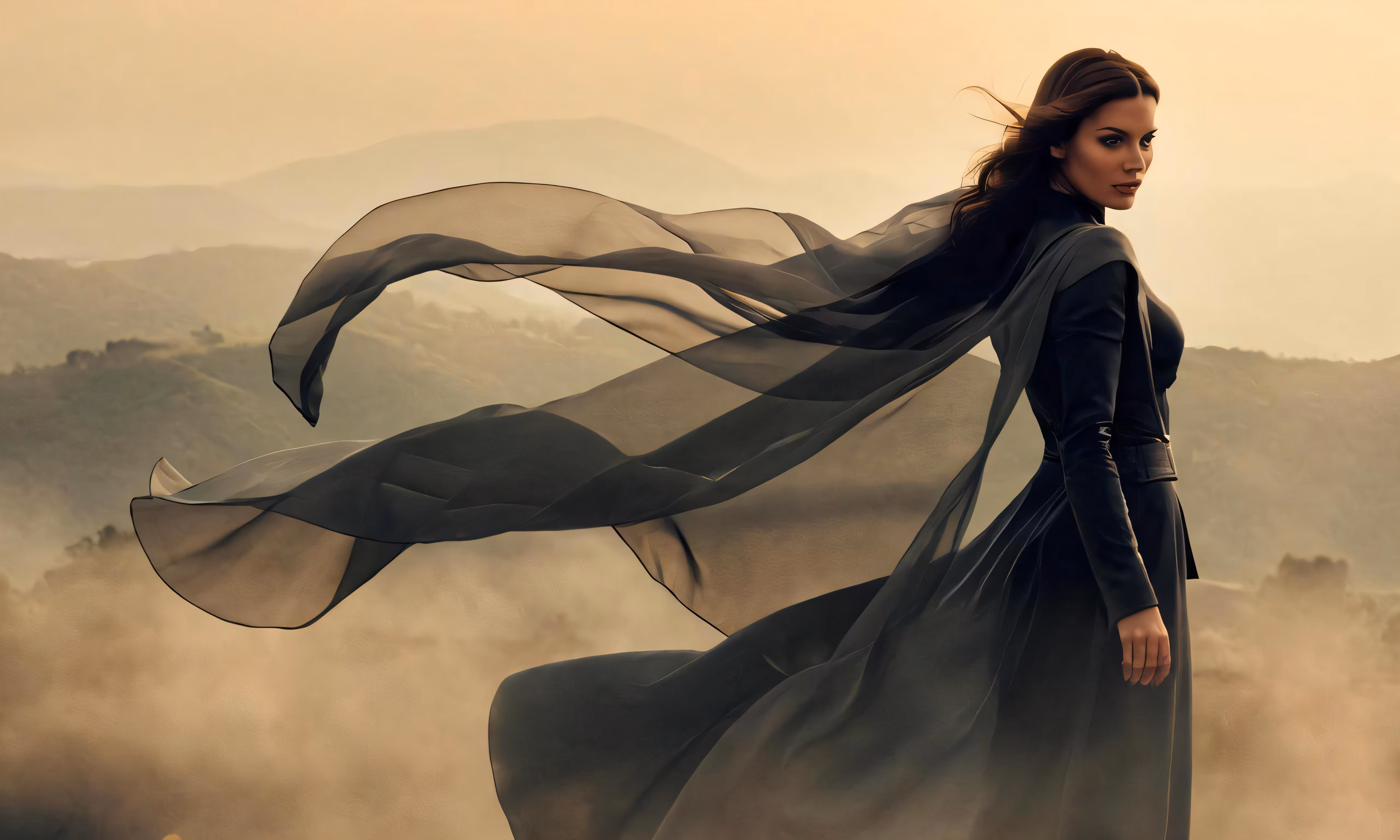 High resolution picture, free to use, the beautiful woman has her long black dress and coat on