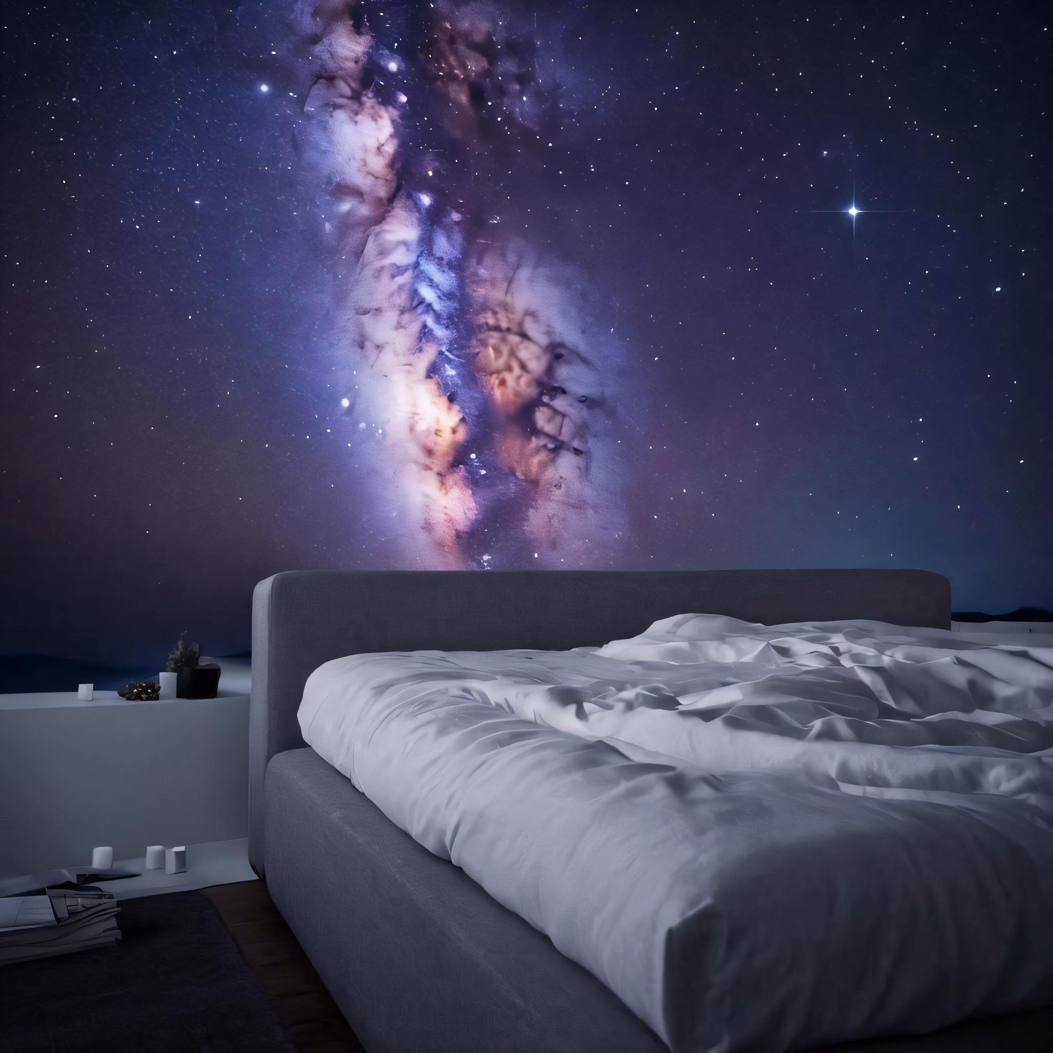 High resolution picture, free to use, the bed is made and has an image on the wall