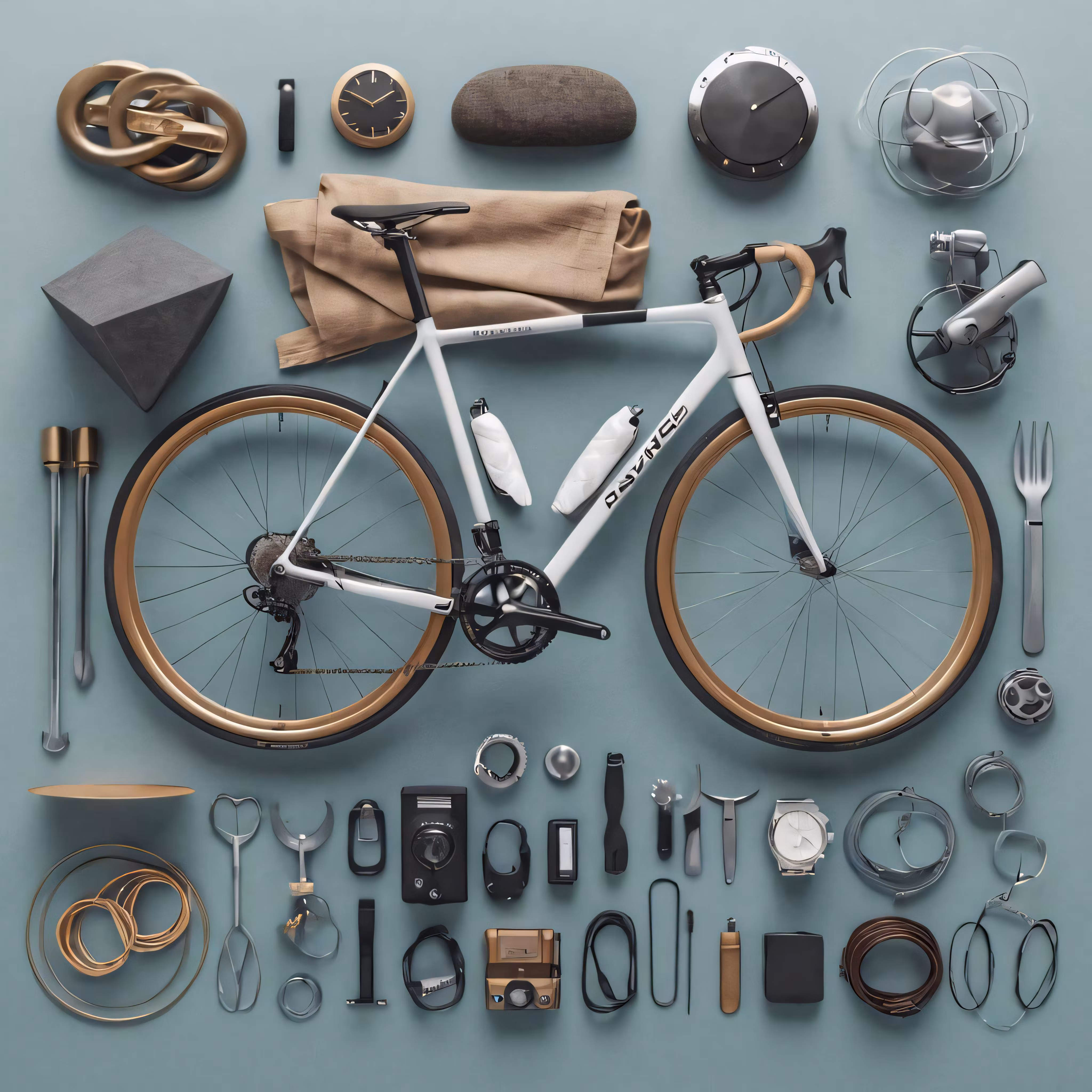 High resolution picture, free to use, the bicycle is surrounded by accessories that include a cellphone