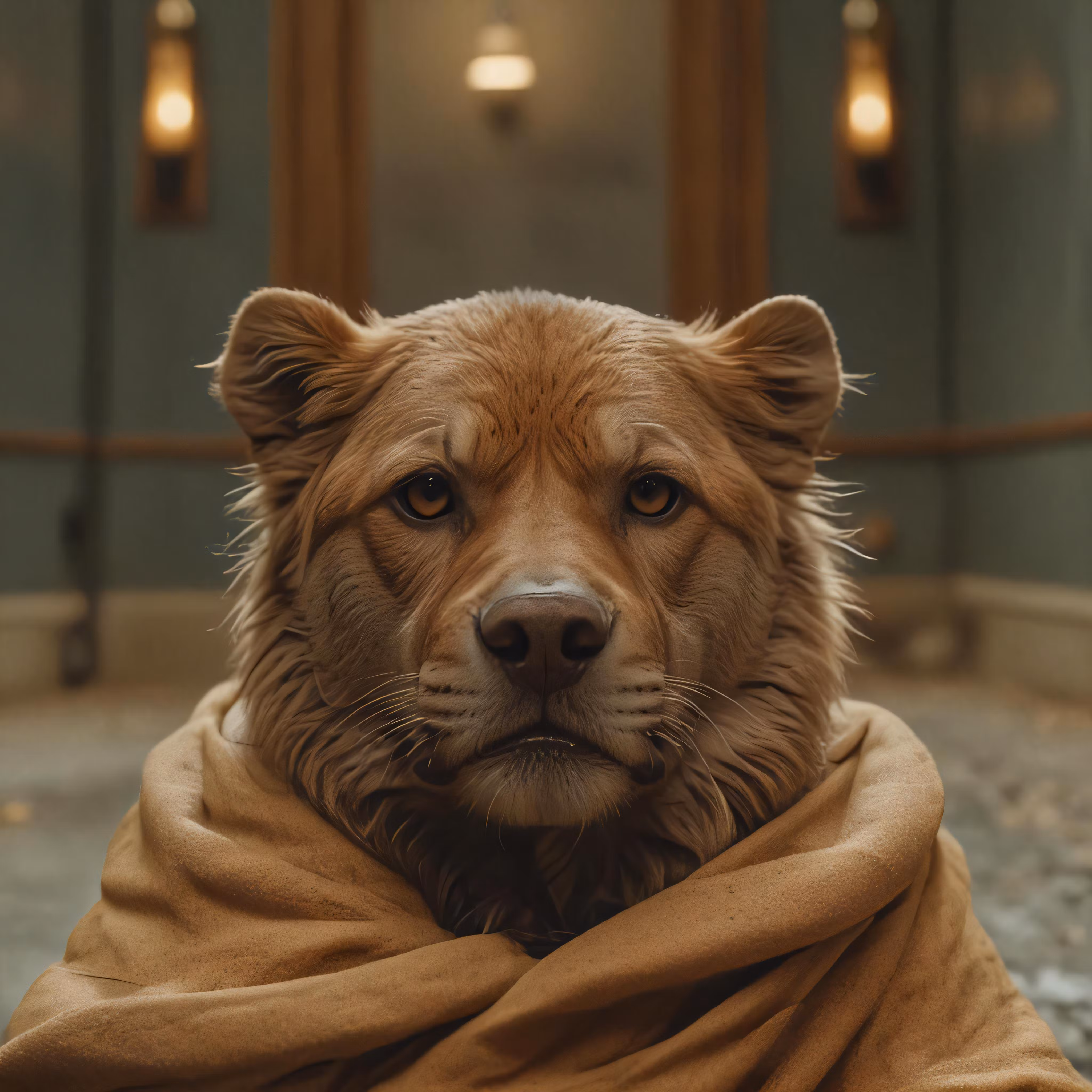 High resolution picture, free to use, the big dog has a blanket on its head