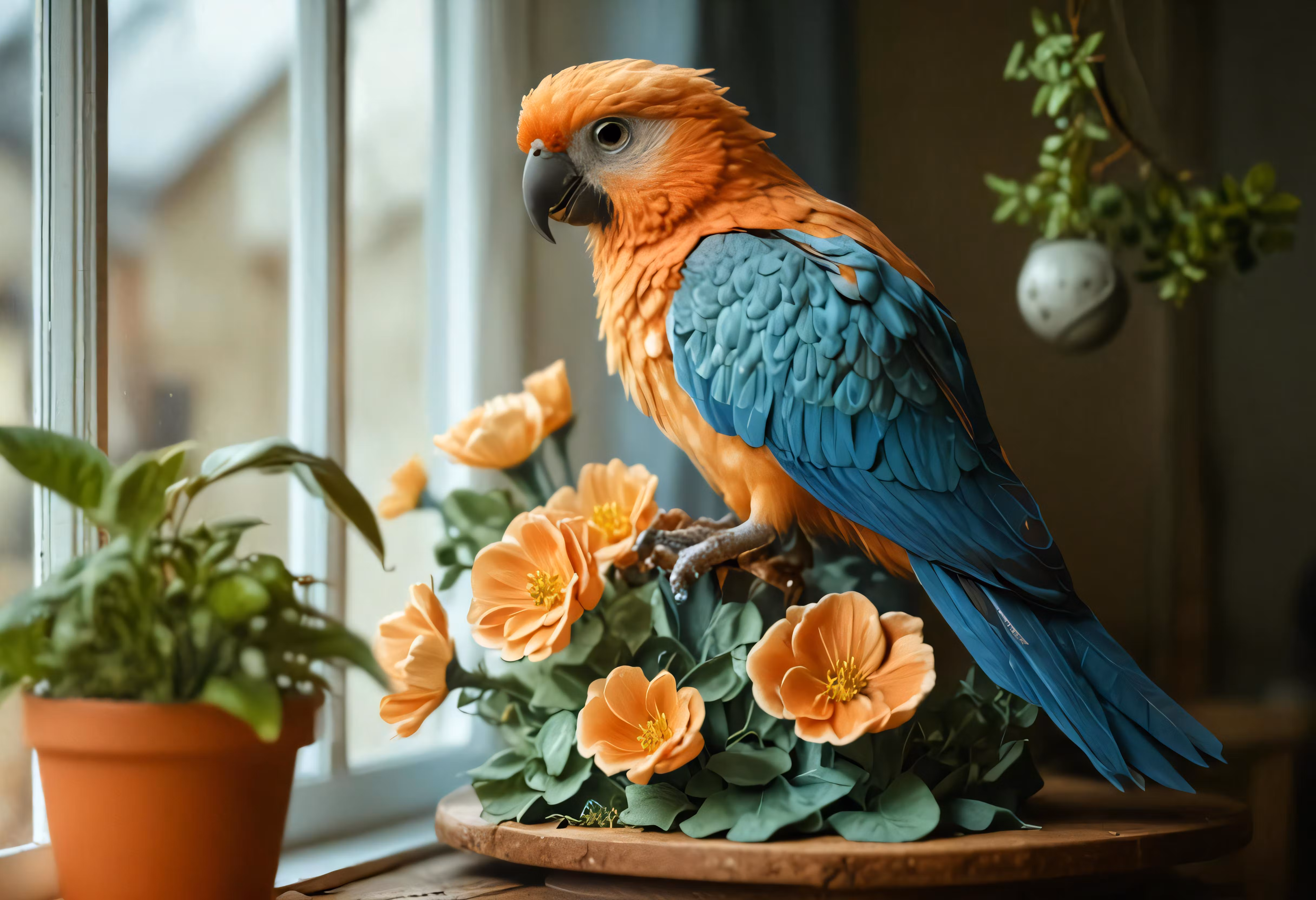 High resolution picture, free to use, the bird is standing on the plate near the potted plant