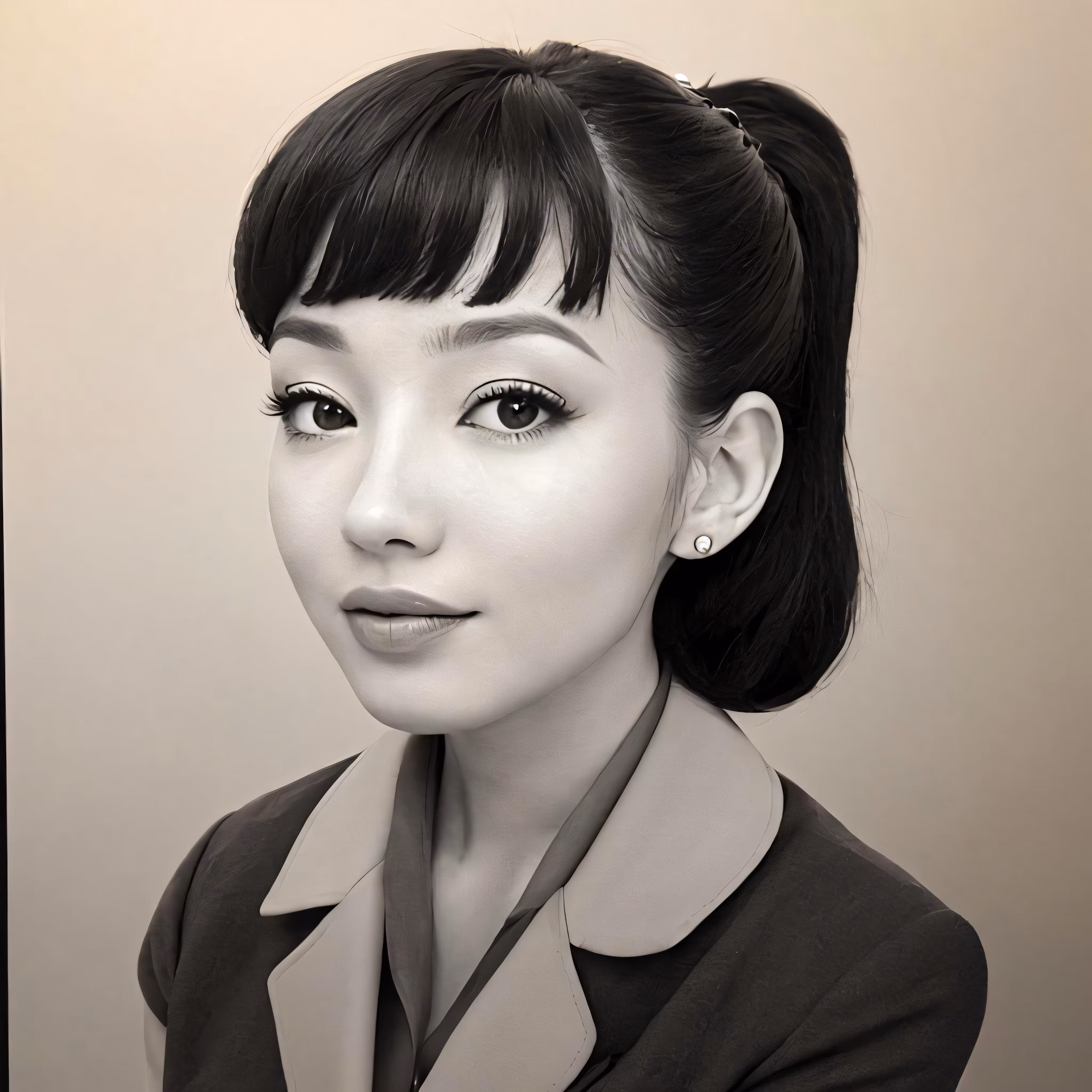 High resolution picture, free to use, the black and white photo of an asian girl with long dark hair and an eyeliner