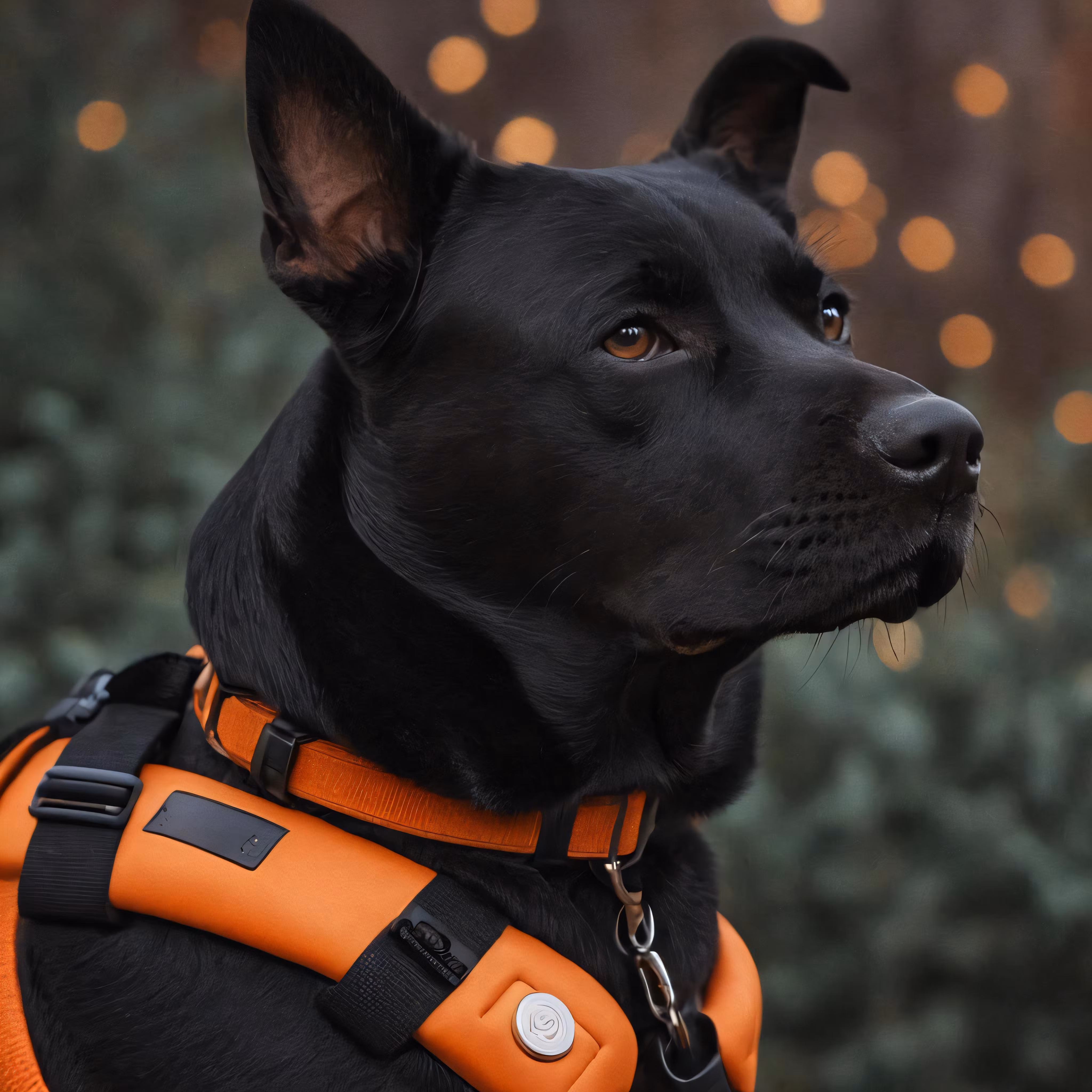 High resolution picture, free to use, the black dog is wearing an orange collar