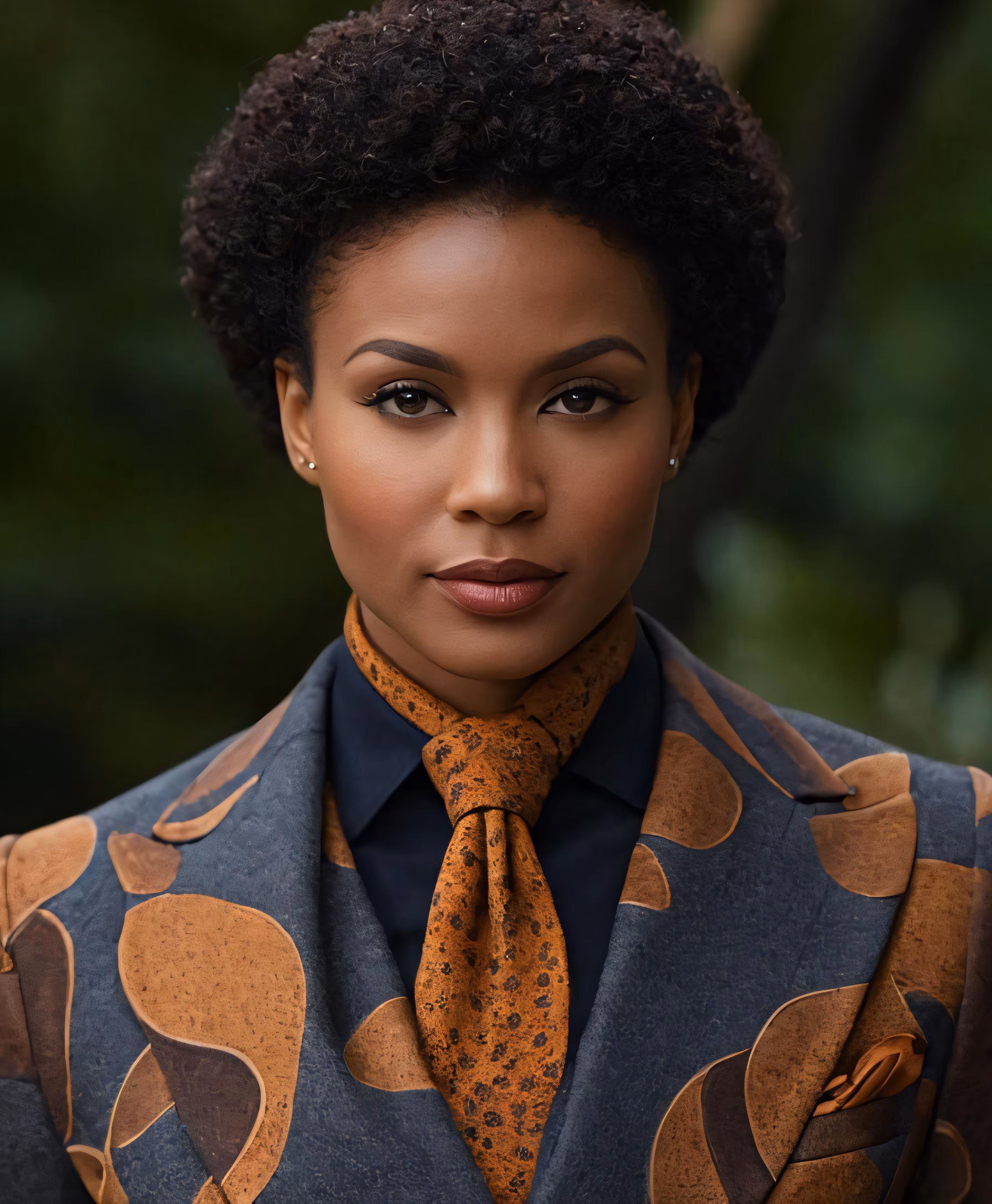 High resolution picture, free to use, the black woman is wearing a suit and a scarf