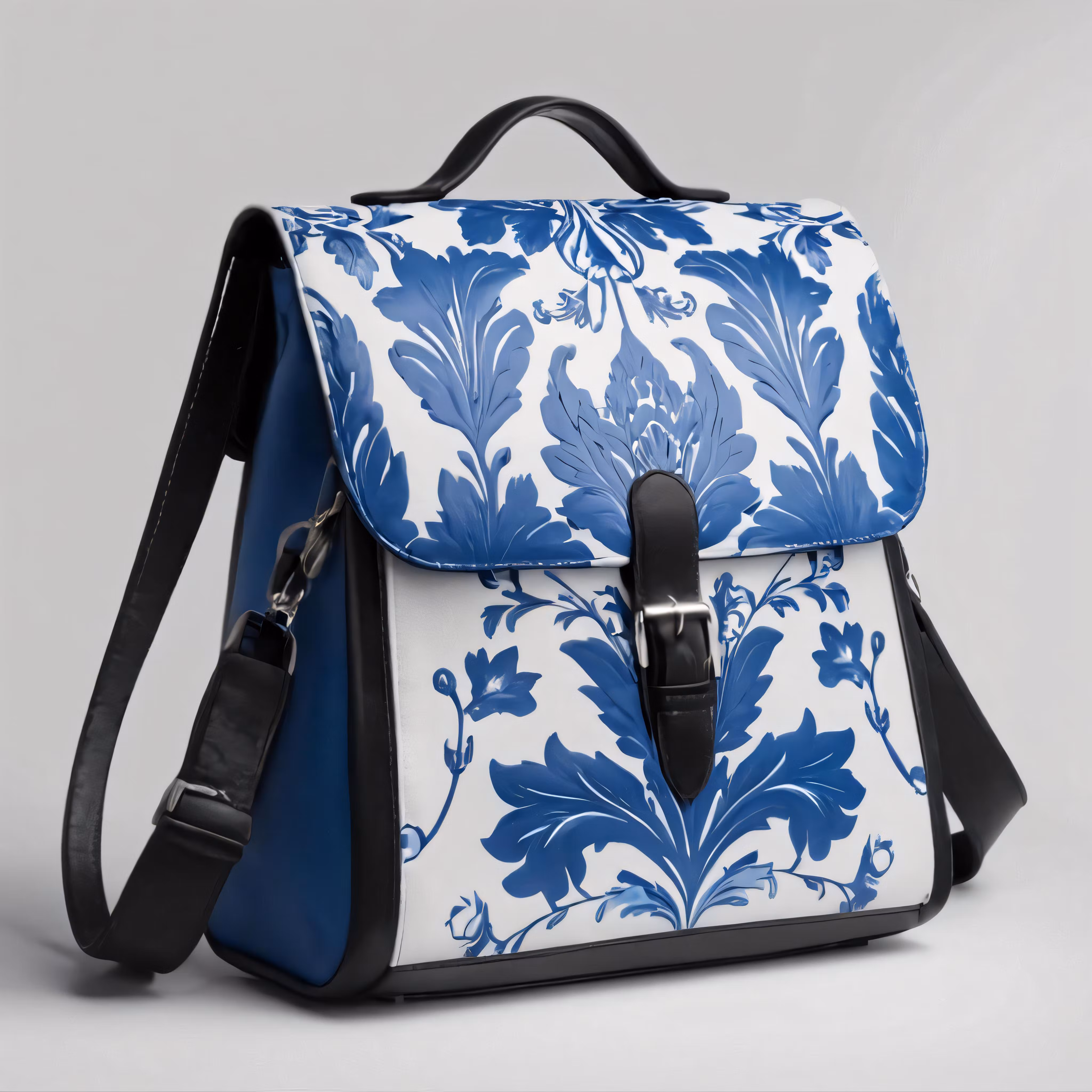 High resolution picture, free to use, the blue and white backpack is shown on top of a gray surface