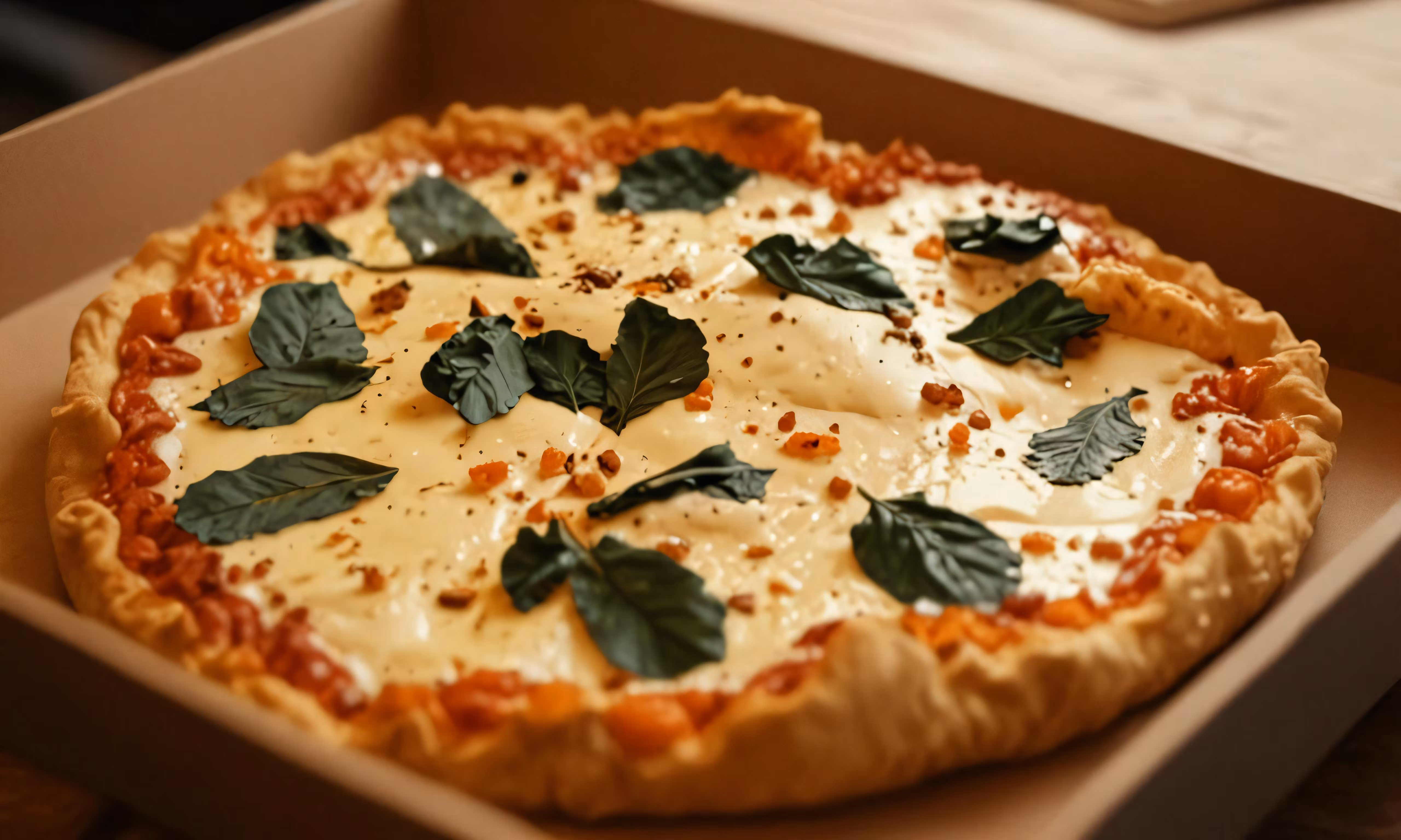 High resolution picture, free to use, the box is open showing an uncut pizza with leaves