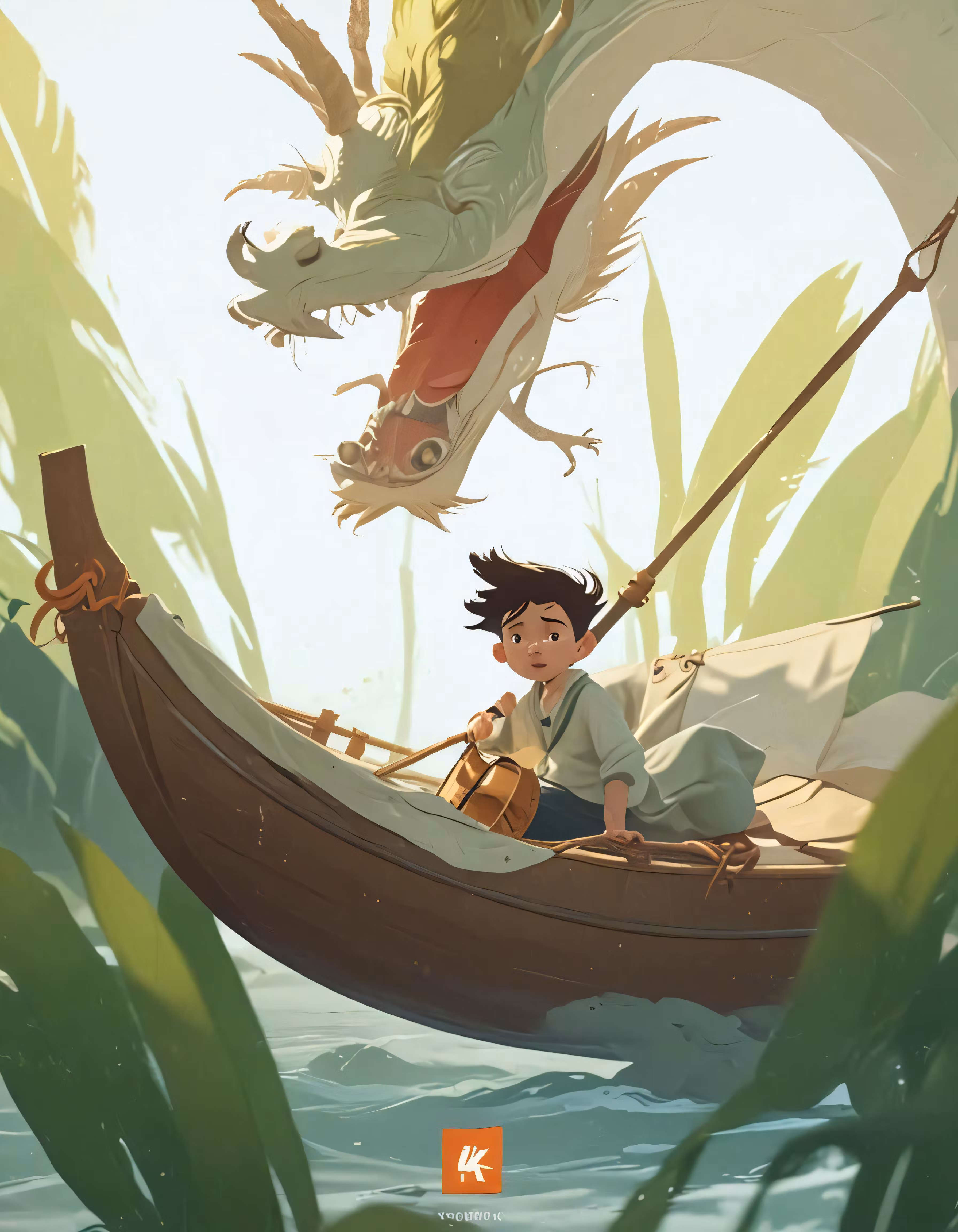 High resolution picture, free to use, the boy is rowing in a small boat with two dragon heads